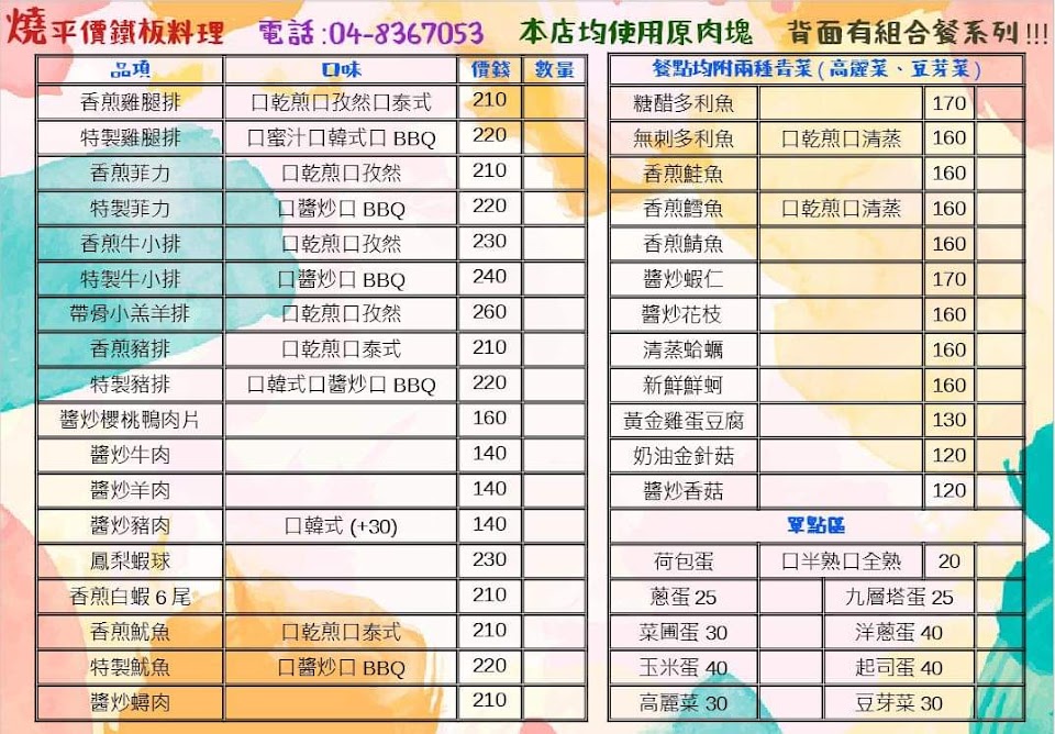 2024最新在地推薦餐廳的菜單_燒。平價鐵板料理-員林平價鐵板燒|在地推薦|必吃美食的菜單、圖片