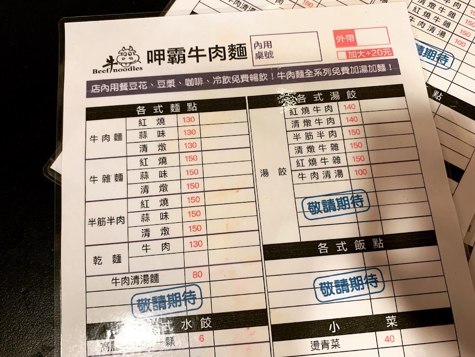 這間餐廳吃的人真的很多,大約中午12時左右整間店大概就差不多坐滿了,就算一個人來也不需要太尷尬,有些在比較邊邊角角的位子很適合一個人坐,又不會佔到大桌,只是座位和裝潢不是很精緻,不過平價餐廳就已經不錯了,找到用餐的座位就可以先點餐付款。 熱門的餐點是牛肉麵、水餃和小菜,東西不貴,就是不怕你吃,牛肉麵免費加湯、加麵是基本,豆花、豆漿、飲料機還是無限取用,很符合店名呷霸的特色。 牛肉麵主要有3種湯頭,裡面的牛肉塊雖然不多,但是不會太硬,麵感覺是拉麵煮的很有嚼勁,湯喝起來也還不錯,整個吃下來非常的有飽足感。 服務 內用 餐點類型 午餐 平均每人消費金額 $1-200 建議的餐點 半筋半肉紅燒牛肉麵 蒜味牛肉麵 免費豆漿豆花