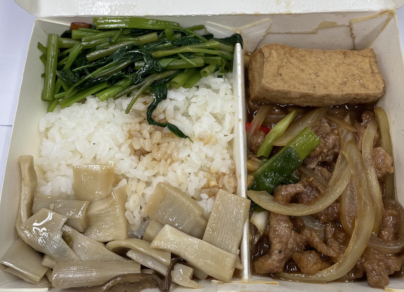蔥爆豬肉飯80元,覺得菜色越來越隨便了…味道沒變,但CP值降低….今天沒有蛋,給的是油豆腐,菜也很少。