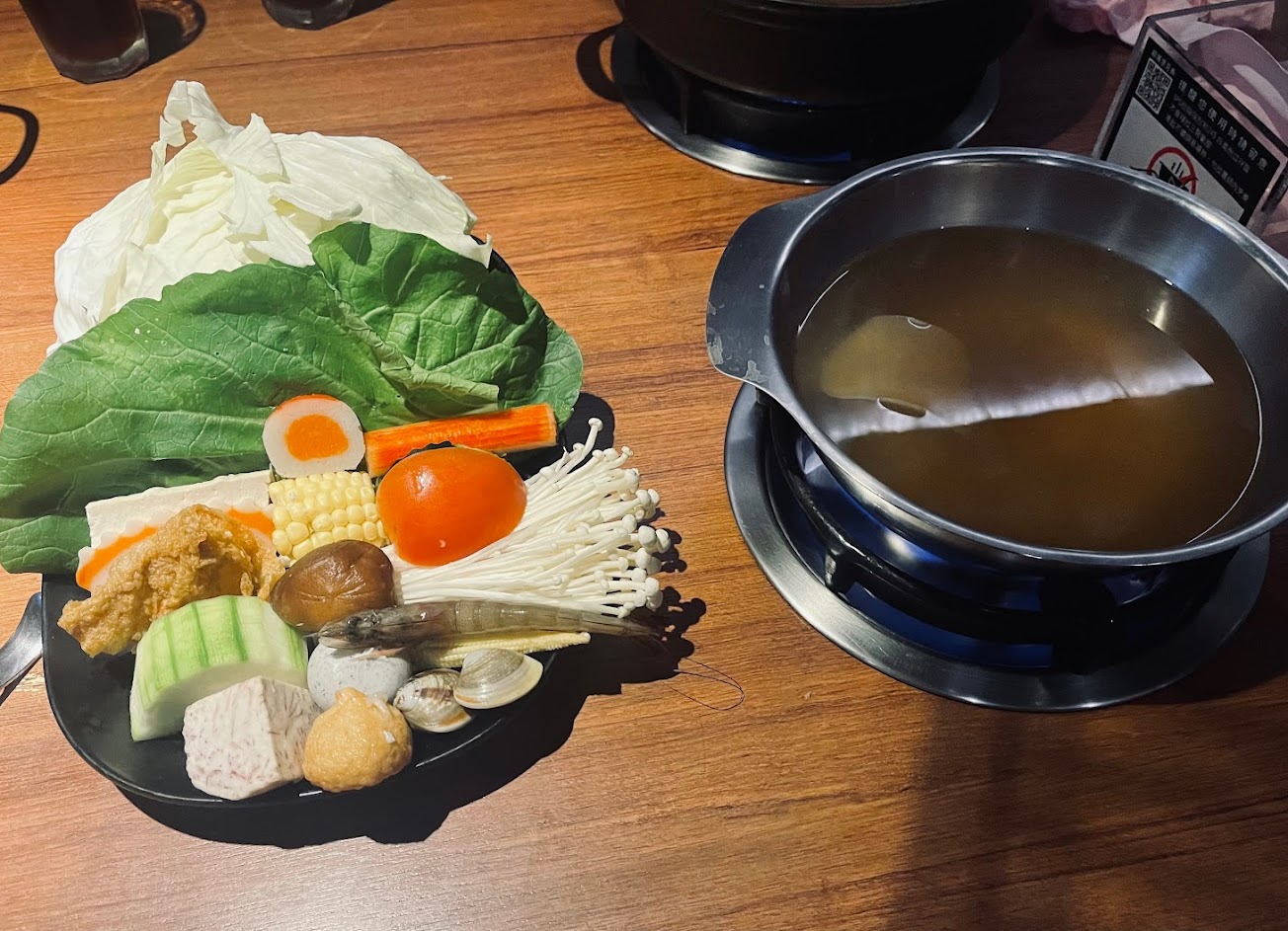 菜盤都很豐富,蔬菜有夠多!壽喜燒的菜盤跟和風的不一樣,居然有茄子 紅蘿蔔? 玉米都很甜 也有蝦子(是新鮮的)跟蛤蜊,超推的菜盤?? 湯頭一般~服務很好!時不時就會來問要不要加湯 完全不用主動去問!免費續的紅茶 ?? (甜度台南人給過? )飯後還有提供蘋果醋 解膩很讚 整體很棒!收餐盤很勤、翻桌率算快,就是附近不好停車而已?