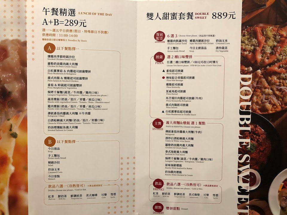 第一次來,原本想說平常日晚上餐廳人好像有點少,有點怕怕的;後來點了泰式海鮮搭配南瓜麵、番茄起司+蕈菇起司雙拼比薩?,ㄧ吃下去不得了,每樣東西都好好吃啊,泰式醬料調的真好,材料給的有夠大方,吃得到蟹肉(非蟹肉棒那種假蟹肉),蝦殼也幫忙去完殼,蝦頭鮮甜、新鮮,比薩我加價成為13吋薄片,服務生貼心送上6種佐料(胡椒、起司粉、蒜蓉、辣椒、迷迭香等)入口滋味令人讚嘆…