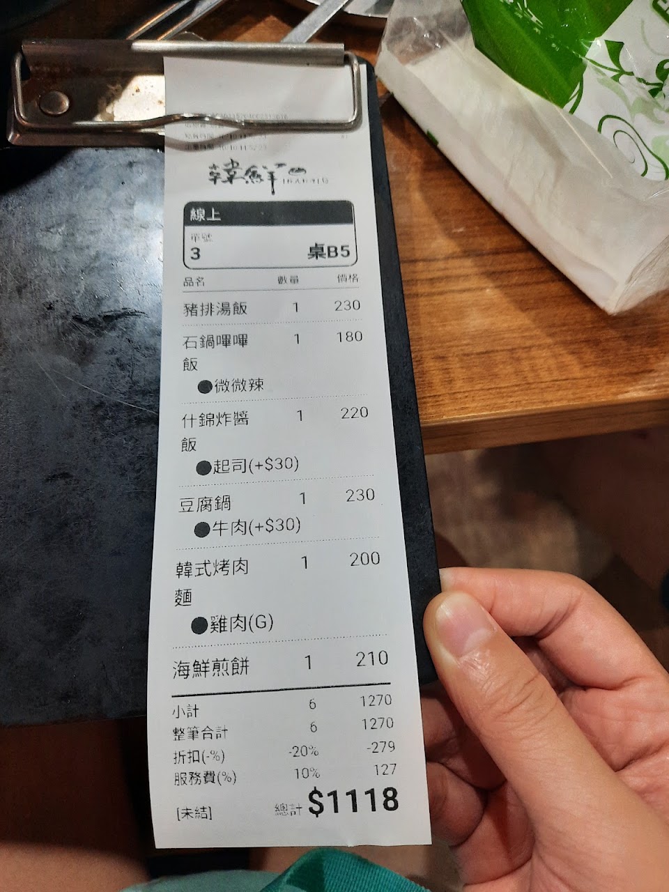 餐點的部分點了韓式炸雞但覺得口味比較偏甜不夠辣,有收服務費但我覺得服務並沒有到很好,餐具跟小菜都是自助式的收服務費⋯⋯