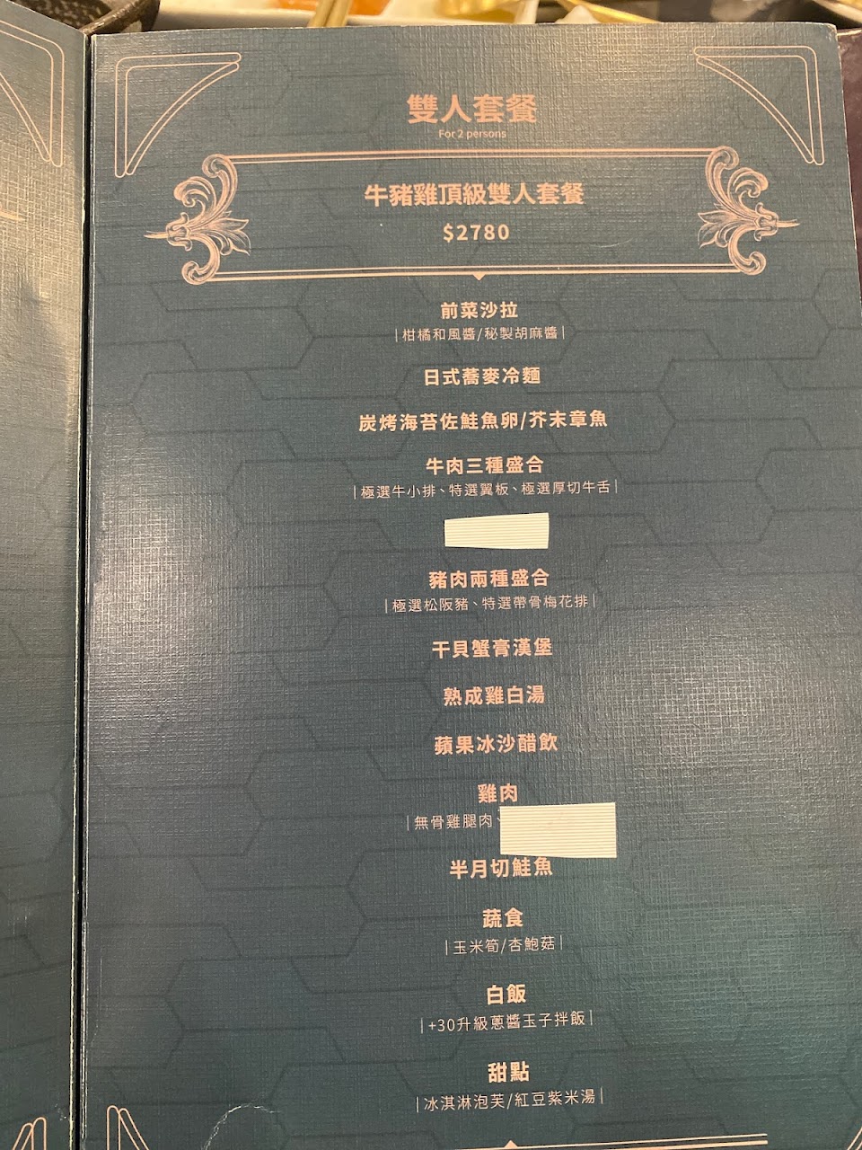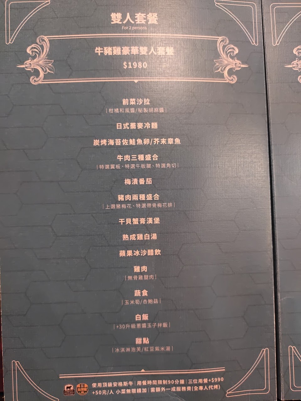雙人份的餐點豐盛、多樣、份量十足。有專人服務烤肉可以輕鬆用餐。