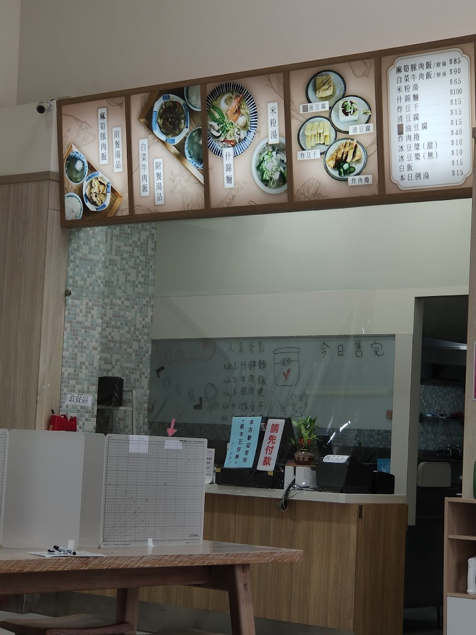 兩種飯類定食的分量都剛剛好,如果真的很餓,也可以多叫一份豬頭皮+白飯,什錦面分量也很多,但是因為我是貓舌頭,吃面會花比較多時間,所以都是吃飯,飯菜吃完了例湯差不多還溫溫的,正好喝。什錦面中的料超豐富,不辜負它的價位,基本上一碗面比定食吃起來要更有飽足感,而且不需要叫小菜。豆漿……覺得還好,不難喝但也算不上好喝,關鍵喝起來都蠻新鮮的,不會有那種放很久的口感 服務 內用 餐點:5 服務:5 氣氛:5
