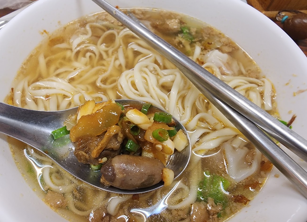 老闆態度親切,環境桌椅餐具乾淨衛生。除了不好停車,在永靖街區難免。牛肉飯份量足,青菜新鮮,滷豆干豆腐有入味,還有半顆滷蛋,以八十幾圓價位是物超所值。餛飩湯中規中矩,只是餛飩要包折有一定的方式,抓袋型的餛飩樣式不對。牛肉湯有貼近演化不會有太強的口感,符合現在的人口味。滷汁肉燥有用心,燙青菜淋上肉燥鹹淡剛好。加牛肉麵的酸菜如果能夠再炒過,去掉生酸菜味應該更好。