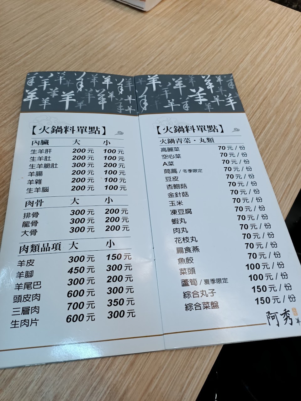 來到溪湖玩,發現整條馬路上羊肉爐招牌琳瑯滿目,查了一下,知道這裡是羊肉販售集中地,選了「阿秀羊肉爐鍋」,對面是市場旁邊有停車位,方便停車。湯底分為中藥、薑絲與全酒中藥三種(我們開車來,特別告知不加酒),內容物有瘦肉片、綜合或三層肉的可選擇,加點了綜合丸子、綜合蔬菜盤,蔬菜熬煮後更增風味,沾醬有豆腐乳,沾每樣食材都增加風味,湯頭喝來整個肚子都暖呼呼,真的會上癮,一碗接一碗,還炒了一份炒羊肚,也非常美味,麵線也不錯吃喔。 阿秀店面清爽,服務人員親切,裡面有包廂選擇。 餐點:5 服務:5 氣氛:5