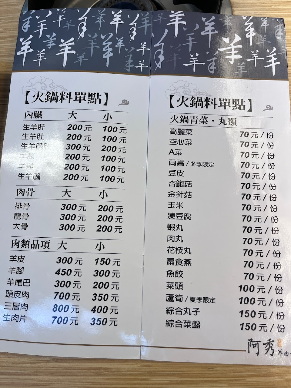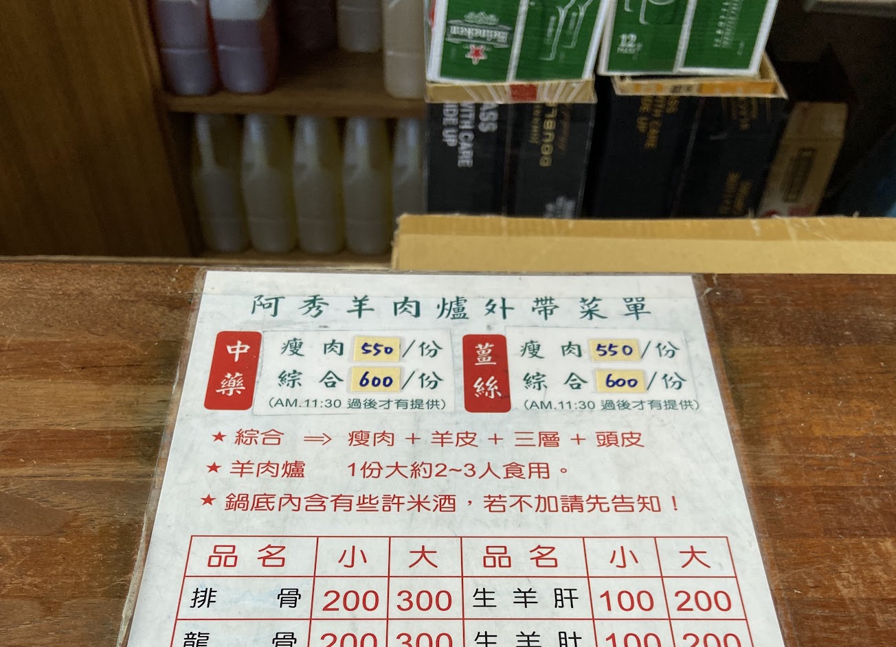 阿秀是內行人在吃的羊肉爐~ 場地算乾淨有裝璜,羊肉套餐真的好吃,湯底清甜口味佳,不會有騷味。 但是外帶櫃台服務不親切,動作又慢有待改進哦!