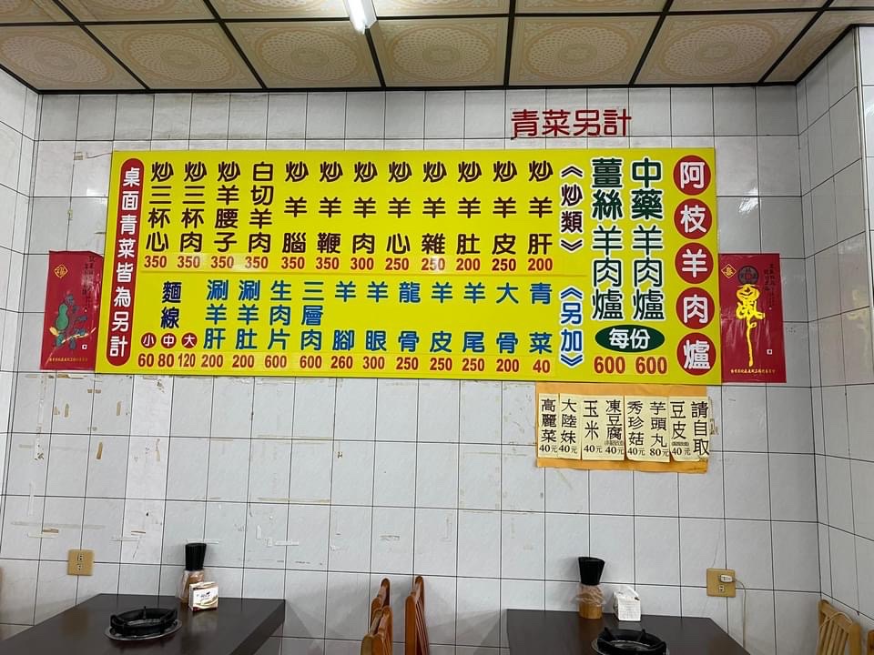 國道1號員林交流道211公里下,附近羊肉店多,羊肉爐計分中藥,薑絲及老酒三種口味,均為600元,火鍋配菜一盤50元,麵線60元;另尚有快炒可供選擇,不錯吃。