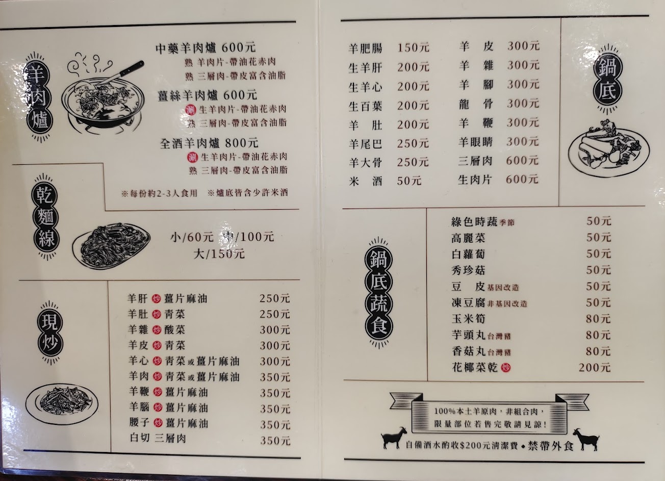 停車場跟用餐環境寬敞舒適,但菜單消費價格較附近的羊肉爐戰場來說算偏貴,我們才五個人花了$2420,外籍服務員來講話快又很難懂,一來就點了藥膳羊肉兩份這樣就$1200,是直接煮在裡面,不是現涮的肉片,口感很柴也沒整塊的肉,湯頭口感還可以,麵線也普普,炒羊肉一份$350份量也太少,要求加湯也加的不甘不願整個感覺很小氣,態度令人不悅,說真的附近羊肉爐戰場有更好的選擇,只是因為阿枝很有名氣就來吃一次看看,一次就好?? …