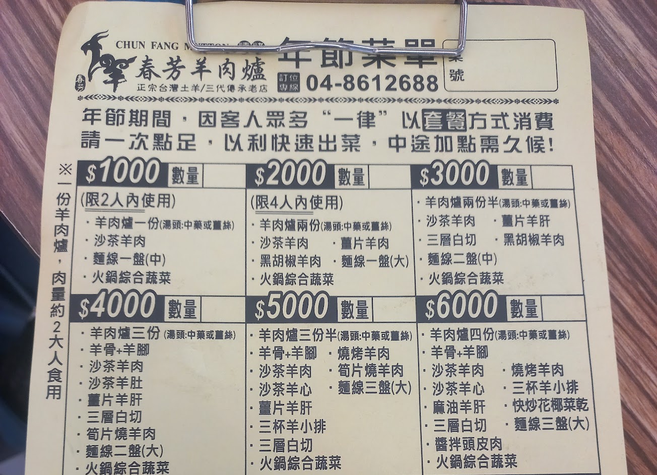 過年期間去用餐,店家說因過年期間只提供套餐,所以點了一份雙人套餐1000元,送來的菜只有少數肉片的羊肉爐(都是湯),還有一盤米線,一盤高麗菜及一盤肉很少的炒牛肉