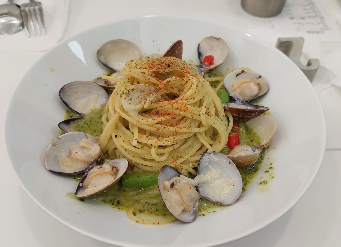 今日吃 青醬白酒蛤蜊義大利麵 150$
