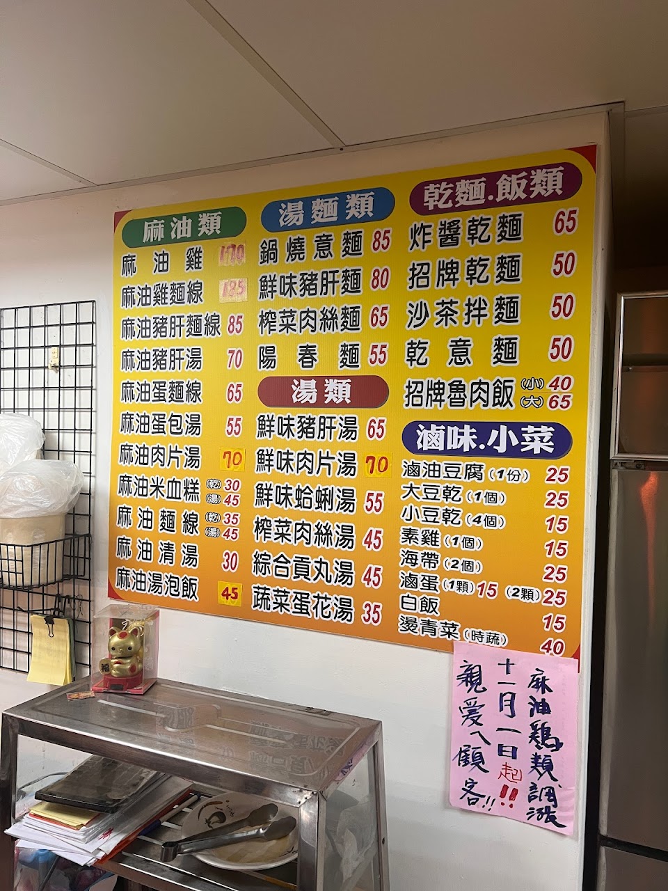 麻油雞湯150 麻油雞麵線165 乾米血30 燙青菜40 滷肉飯(大)60