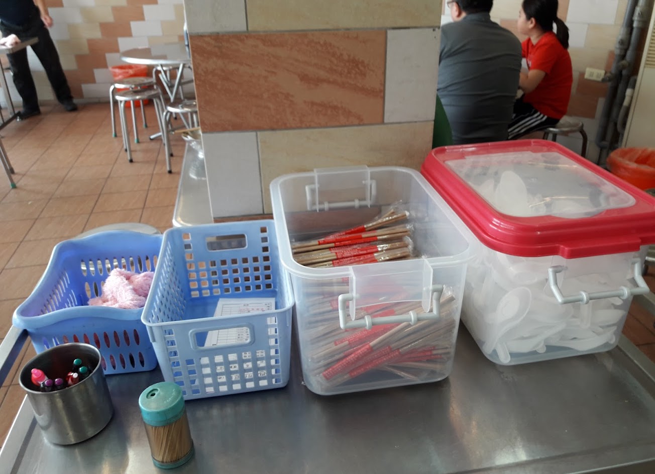 店內店外均有坐位,自取點餐紙、碗筷、紙巾,用