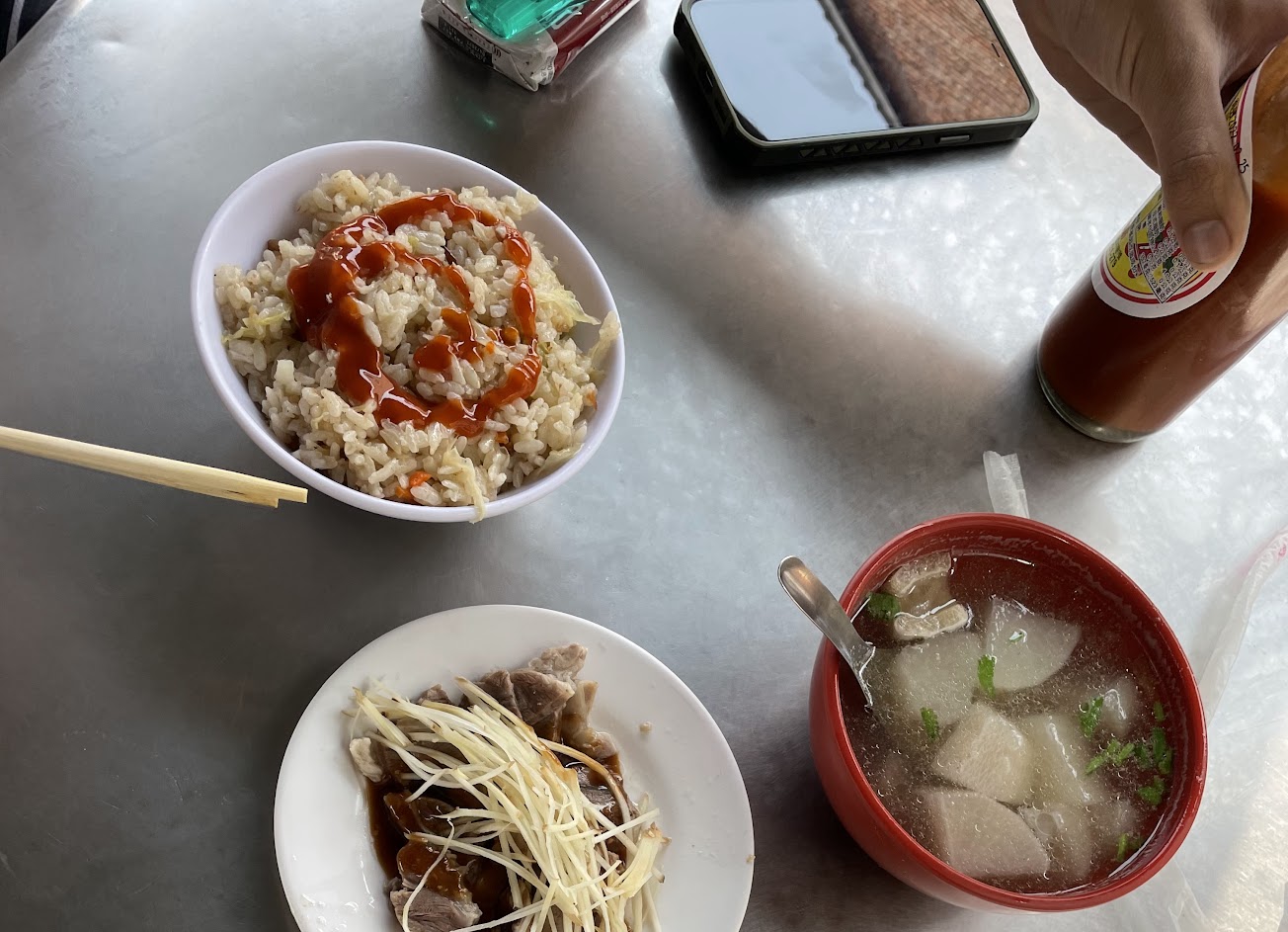 個人覺得整體CP值高,高麗菜飯好吃不重鹹,看當地人吃法是加辣椒醬或店家調製的辣椒來調整口味,内用點餐需先拿紅色膠盒的號碼牌,找到位置後,店員會依號碼順序協助點餐,點餐順序是先點主食菜飯或麵,再來湯品,最後小菜。 湯品個人推薦竹筍湯,雖然當天點的是綜合湯但湯底是竹筍湯,筍湯香甜加上豆腐貢丸組合配料豐富,小菜類點了粉腸,口感軟爛不失嚼勁,韮菜香嫩纖維不會老柴,三層肉軟嫩,喜愛肥瘦Q三修不可錯過,油豆腐滷的不算透,加上滷汁補上不足的鹹香,肉羹湯不是濃稠的類型,湯底是柴魚鮮帶點薄芡和沙茶提味,肉羹組織扎實不鬆散。 可惜是街邊店,天氣稍微影響用餐舒適度。