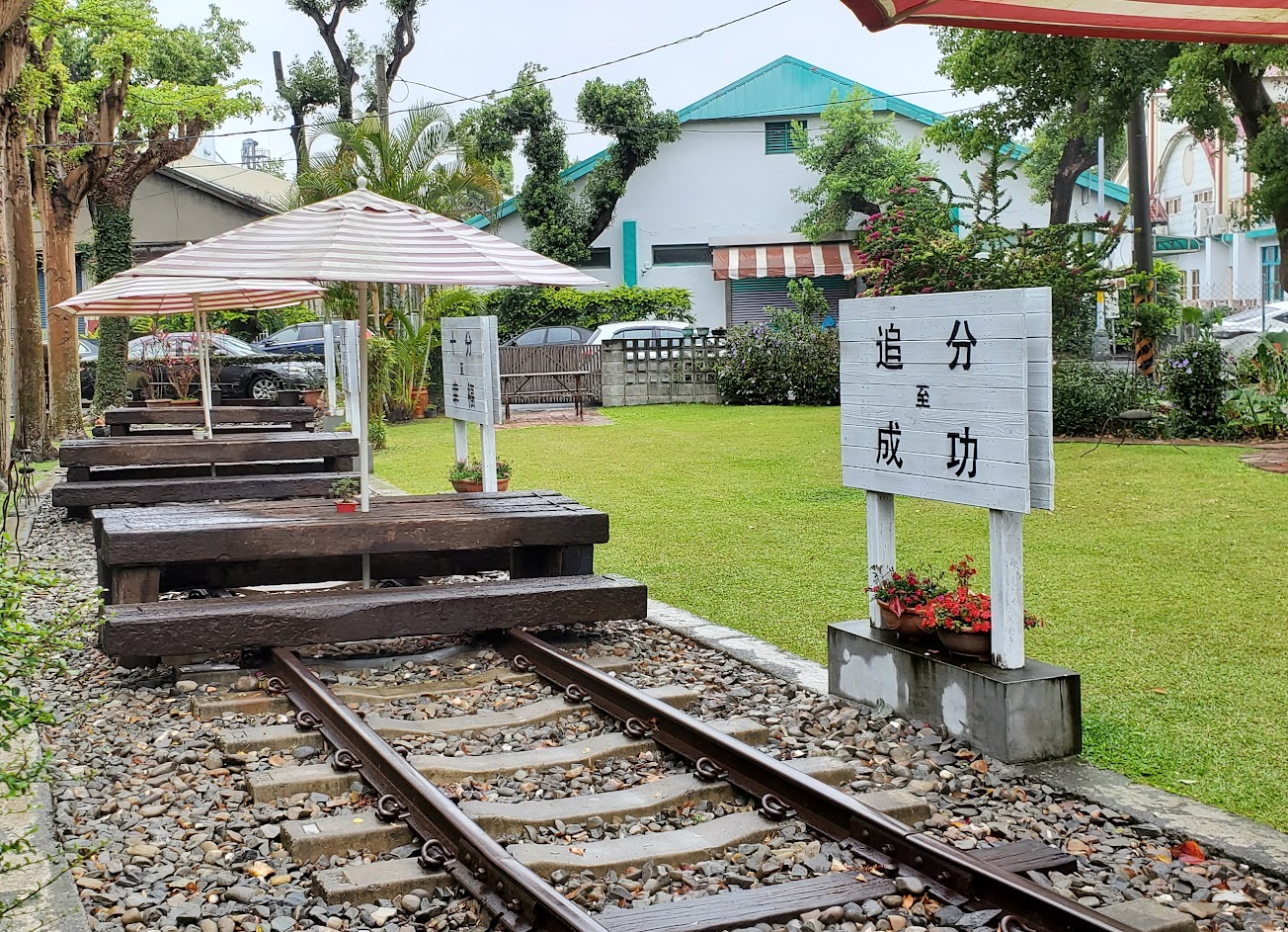 鐵道,真的鐵道與站牌,引人思古幽情,這裡草皮也整理得相當乾淨,是小朋友嬉戲玩耍好地方,園後草雕「雙心石滬」,讓您不用去澎湖,就能感受滿滿的愛,除了創意吸睛,也是情侶、少女IG打卡熱門景點。