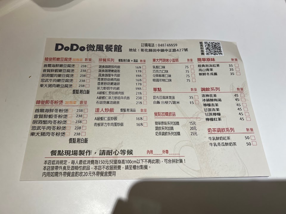 [彰化田中-Dodo微風餐館] – 開了近半年的田中餐廳,每個菜色都是自己製作,連肉都是買原塊回來自己片、自己料理,餐點現點現做大家可以在訂位的時候順便點餐才不會等太久! – 明洞蟹肉豆腐煲+泡菜? ?238 裡頭配料不少,剛上桌還是呈現熱騰騰翻滾的湯頭,入口不會太嗆辣,是可以喝完的風味,裡頭有菇類一大塊豆腐絞肉以及年糕。一旁的小菜,都是店家自己製作,吃完也有飽足感。 – ?A級蝦仁菲力野菇牛肉飯? ?238 蝦仁給的很大塊,吃得出來很新鮮,牛肉有醃漬過,肉質很嫩,不過口味對我來說較為重一點,白飯使用台梗9號米,吃起來較Q。 – Dodo微風餐館 ?地址:彰化縣田中鎮中正路427號 ?電話:04-8748859 ?營業時間:16:30-21:00