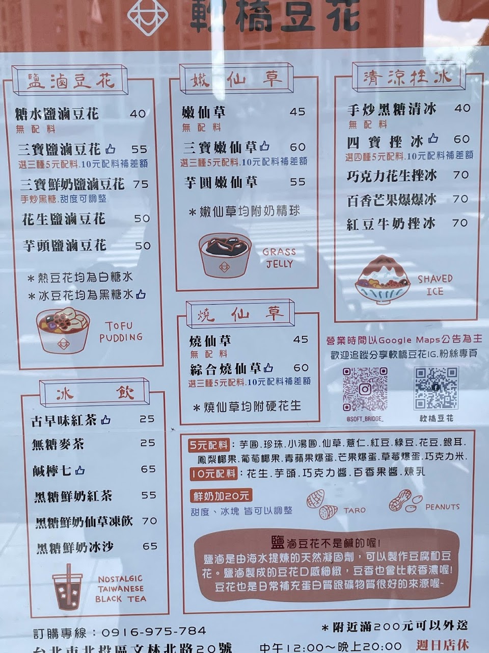 這次點的品項是「三寶鹽滷豆花」(額外加芋頭+10$)所選三種配料:紅豆、白木耳、芋圓,豆花口感是想像中的存在感十足紮實口感,湯底為香濃黑糖水(非稀釋、存在感低落的那種),嗜甜螞蟻族表示爽快!紅豆非軟爛是顆粒分明的,白木耳浸潤糖水後更顯鮮甜,芋圓Q彈得宜,加購芋頭共兩大塊是偏硬的口感,但個人喜歡較軟爛些的芋頭,二訪再嘗試仙草及其他的!