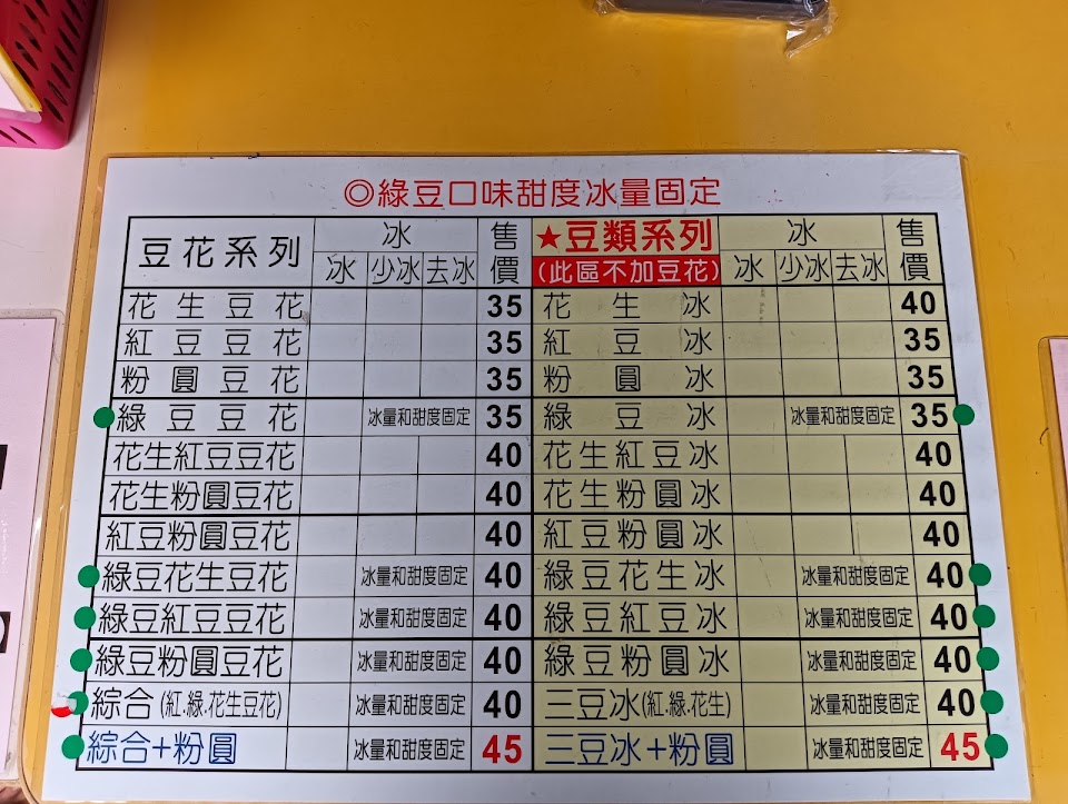 豆花棉密。綠豆冰好吃,但只有夏天供應。