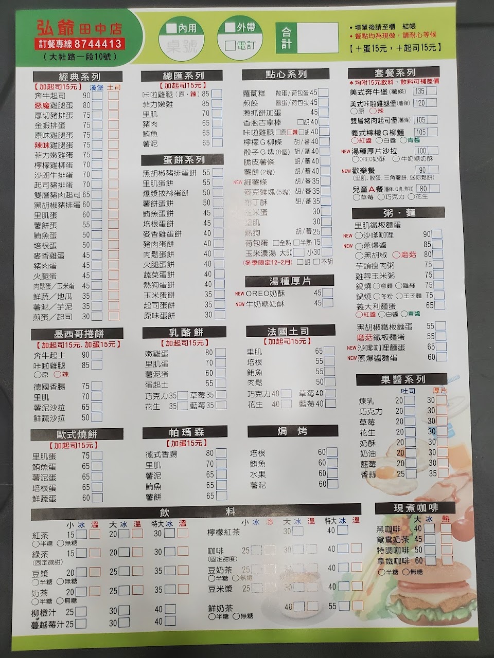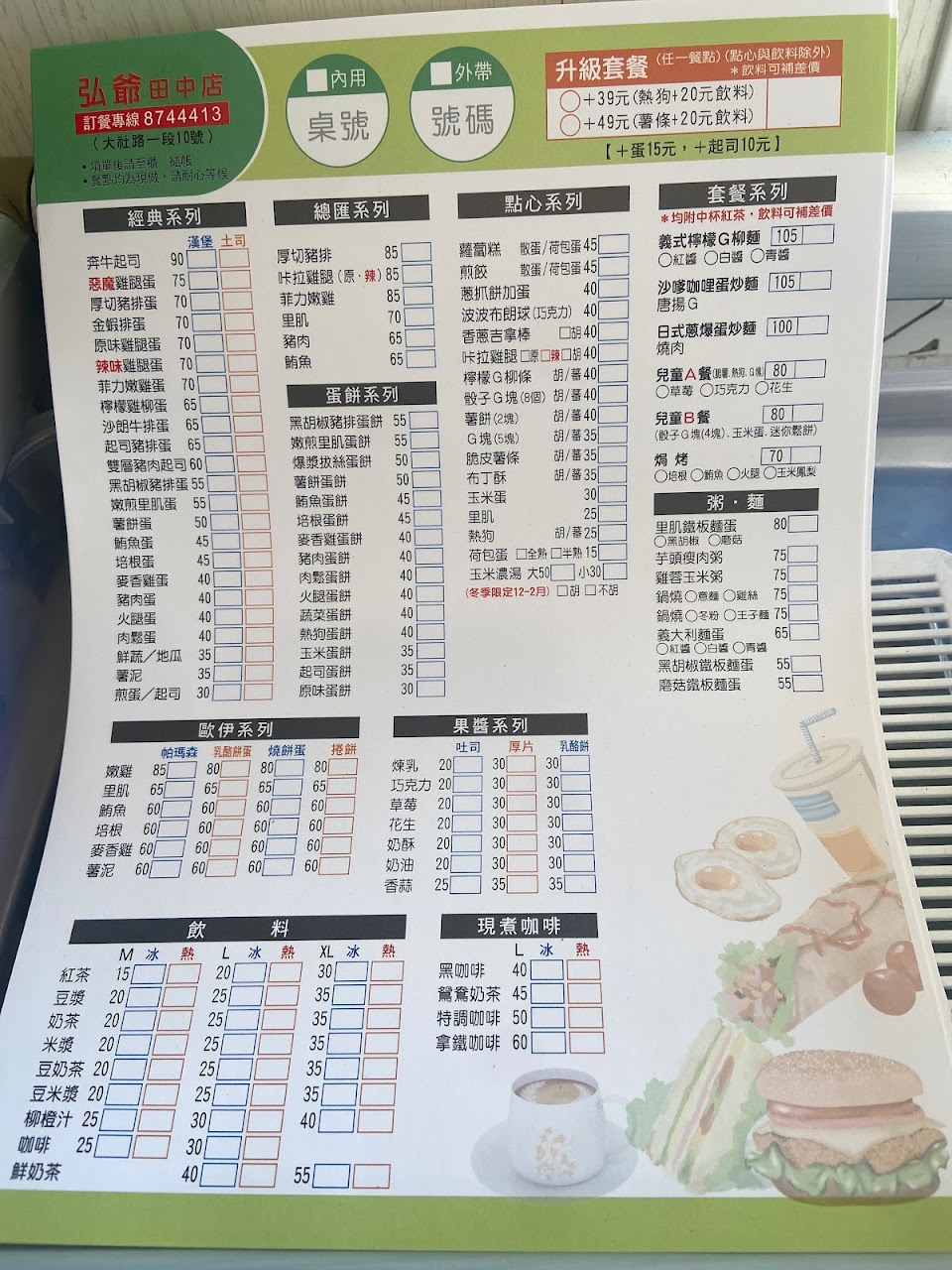 打電話訂,口氣不是很好,明明是連鎖的,菜單應該是全省統一,套餐編號卻不一樣,去取餐時看到他們自製一張不一樣的套餐單子