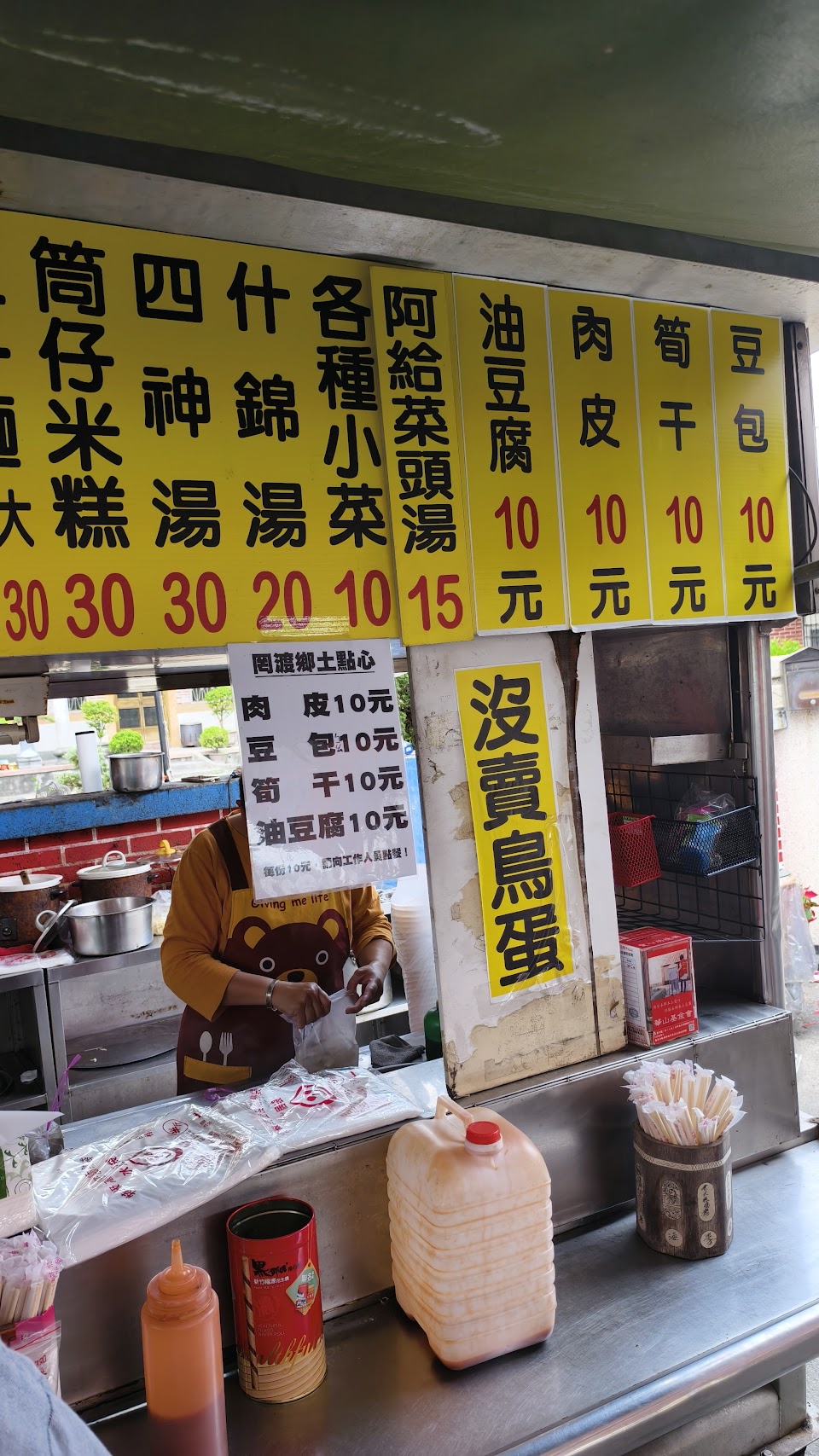 肉皮 鳥蛋各 10 大炒麵 筍干 肉皮 豆腐味噌湯 拉仔麵 米糕 四神湯 什錦湯綜合小菜