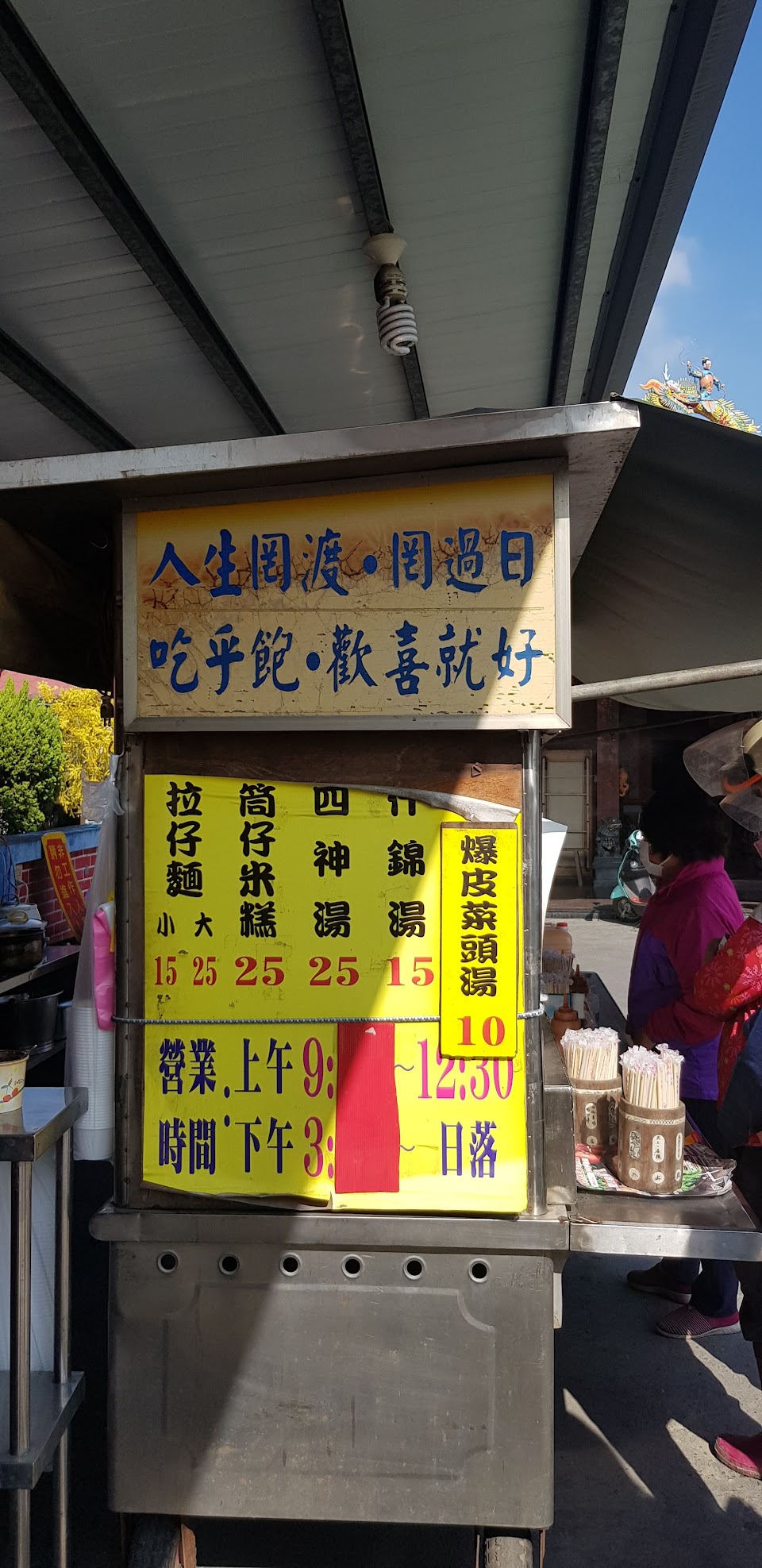 廟埕前的小吃攤 口味中上 最貴的30元 在這萬物皆漲的時侯依然未見老板娘漲價 做粗工只要點個大份麵 一碗四神湯(料超多)一個米糕(各為30元一份且份量大)就可解褲腰帶才吃的完 建議外帶內用在鐵皮屋下較熱另想吃 早点去近正餐時間人排超多且久 避內用桌會排在太陽下無遮蔽物