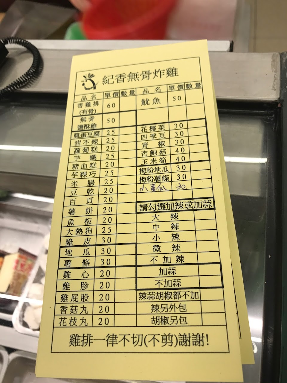 東西包到一半才想到要加辣 在袋口象徵性撒兩下辣粉 雞排起鍋沒瀝油直接打包 魚丸魷魚腿吃得出不新鮮 希望能再改善
