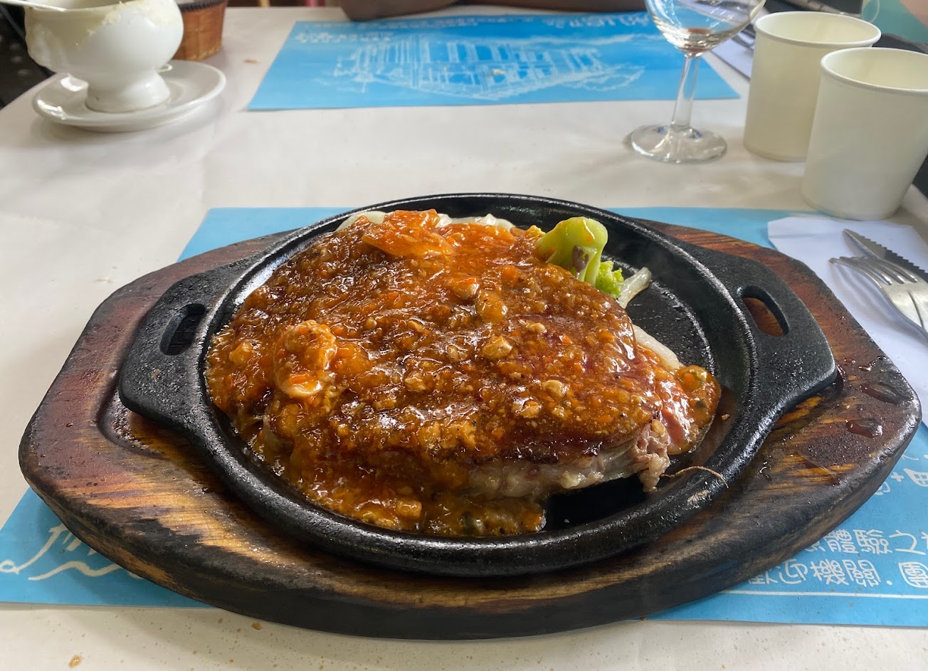 剛好參觀完香久園就來吃了,主角牛排表現的不錯,黑胡椒醬很實在味道夠,鐵板麵是烏龍麵QQ的,整體很喜歡!