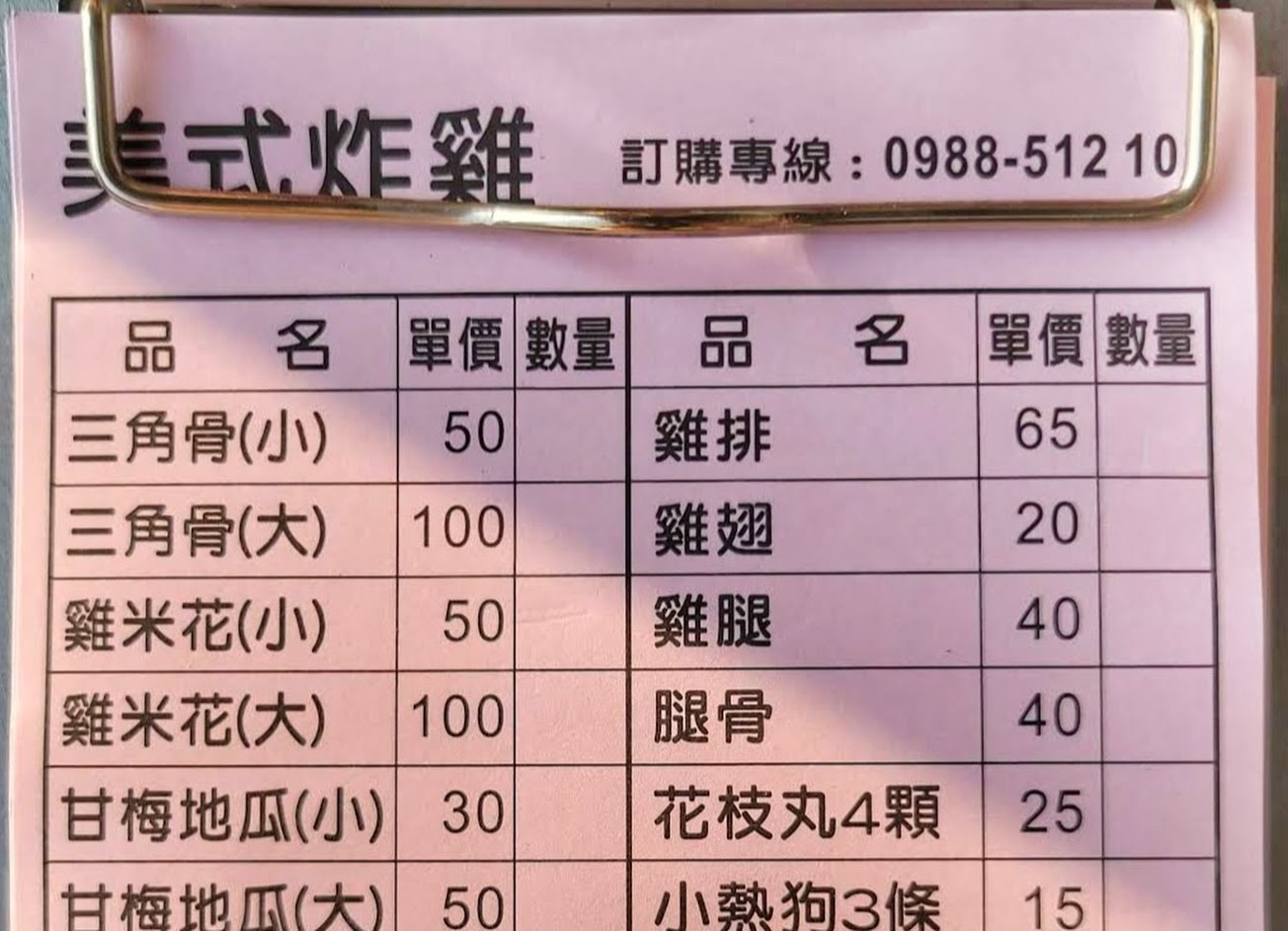 點了地瓜、雞腿、雞翅、雞骨 地瓜不錯,其他還好,肉有點柴 (雞骨是一般說的大雞塊) 車子比較不好停 服務 外帶 平均每人消費金額 $1-200 餐點:3 服務:5 氣氛:5