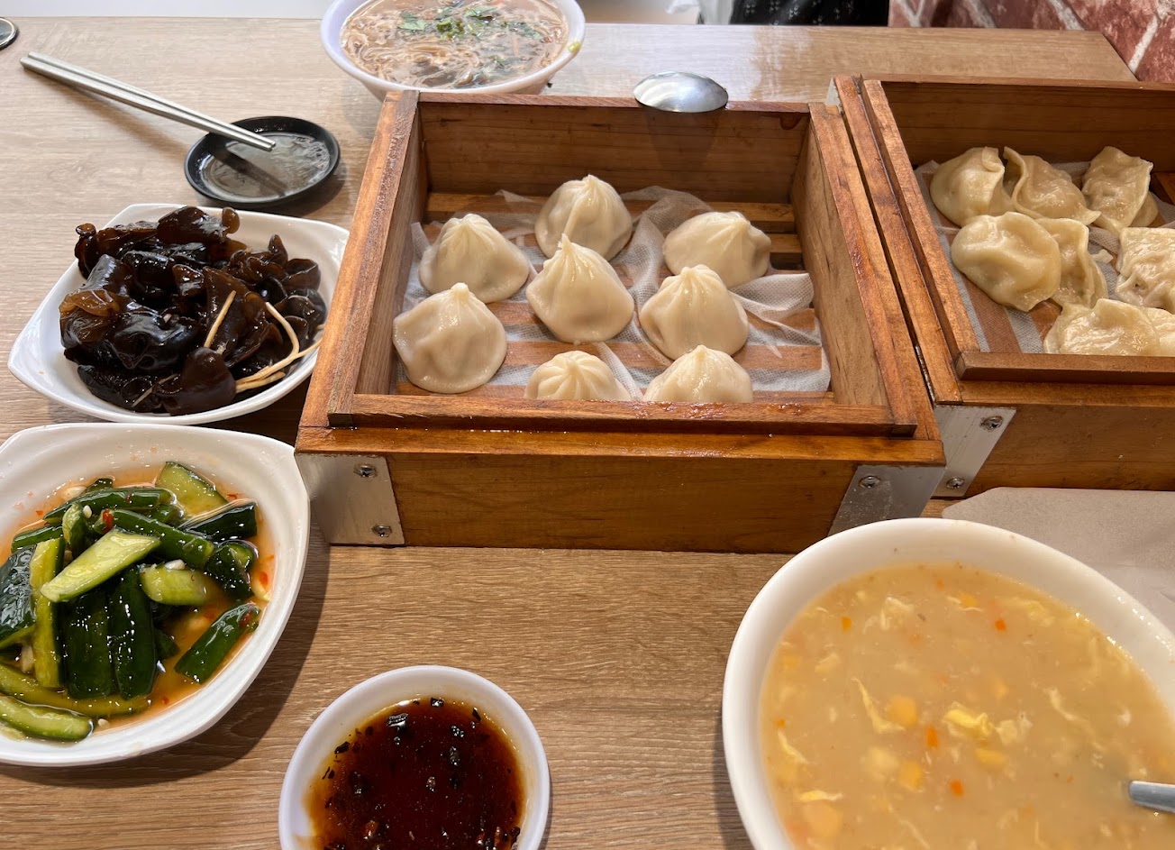 生意很好,鍋貼蒸餃都很好吃,可以叫個小菜配著吃,尤其是小黃瓜在嘴裡考考考的有夠舒服,對了鍋貼的外皮也會考考考的,台語就是恰恰,內餡也飽滿多汁,蒸餃也好吃,跟鍋貼差在外皮的口感。內用醬料可以自己調,我都會弄清醬油加醬油膏加蒜泥再來一點醋,這樣沾起來很好吃,大家可以試看看,那天我媽媽喝酸辣湯感覺很好喝,但是我沒有喝到,我喝玉米濃湯就很滿足了,反正就是很好吃沒得嫌就對了,但是那天我媽媽叫太多兩個人而已哪有辦法吃那麼多,沒辦法我媽媽就是這樣,什麼都愛吃,最後只好打包回去。