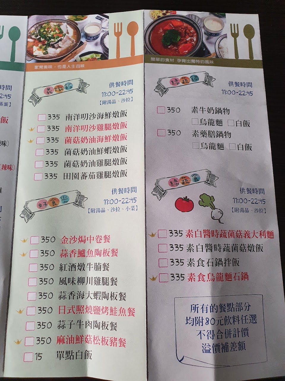 這間店停車很方便 ,適合一家老小或朋友聚餐 ,可惜店家位置不在高鐵之上的山坡 ,但雖然餐廳的位置沒辦法將整片員林的風景映入眼簾 ,但店家仍然有設戶外露天座位區 ,還是看得到一些夜景哦 !這間店的人潮滿滿 ,主要是餐點的豐富度和美味程度吸引了消費者 。這次我和同學聚餐 ,我們每人都點了各自的套餐 ,我吃排餐 ,另一同學點鍋 ,另一個同學吃素食 ,還有素的一整個欄位可以選擇食物呢 ,超貼心 ,同學吃的是素的石鍋拌飯 。讓我們驚艷的是港式蘿蔔糕 ,沒想到外酥脆內軟嫩 ,口感超級棒 ,實在很會處理 。不過水果茶的部分 ,讓我小小失望 ,有點過酸風味層次不豐富 ,覺得如果多一味百香果應該會讓整體味道更加分 。因為這邊沒有用餐時間限制 ,所以很適合三五好友愜意聊天賞夜景哦 !