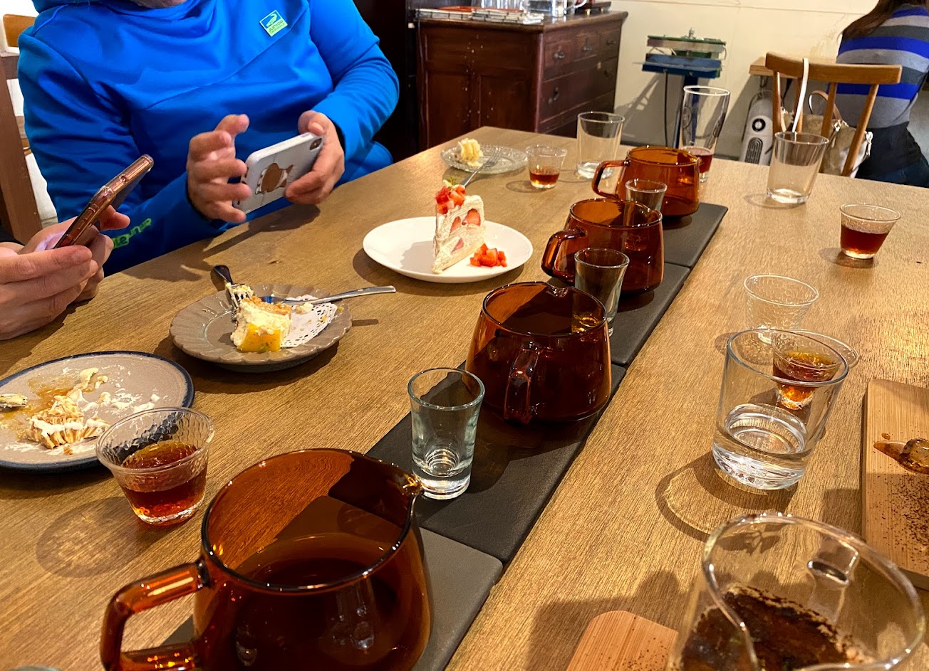 一行人試了四種淺焙單品咖啡(巴拿馬、宏都拉斯等)、花生千層、草莓千層、乳酪蛋糕,每樣都令人驚艷,吃完福井食堂再來這喝下午茶,