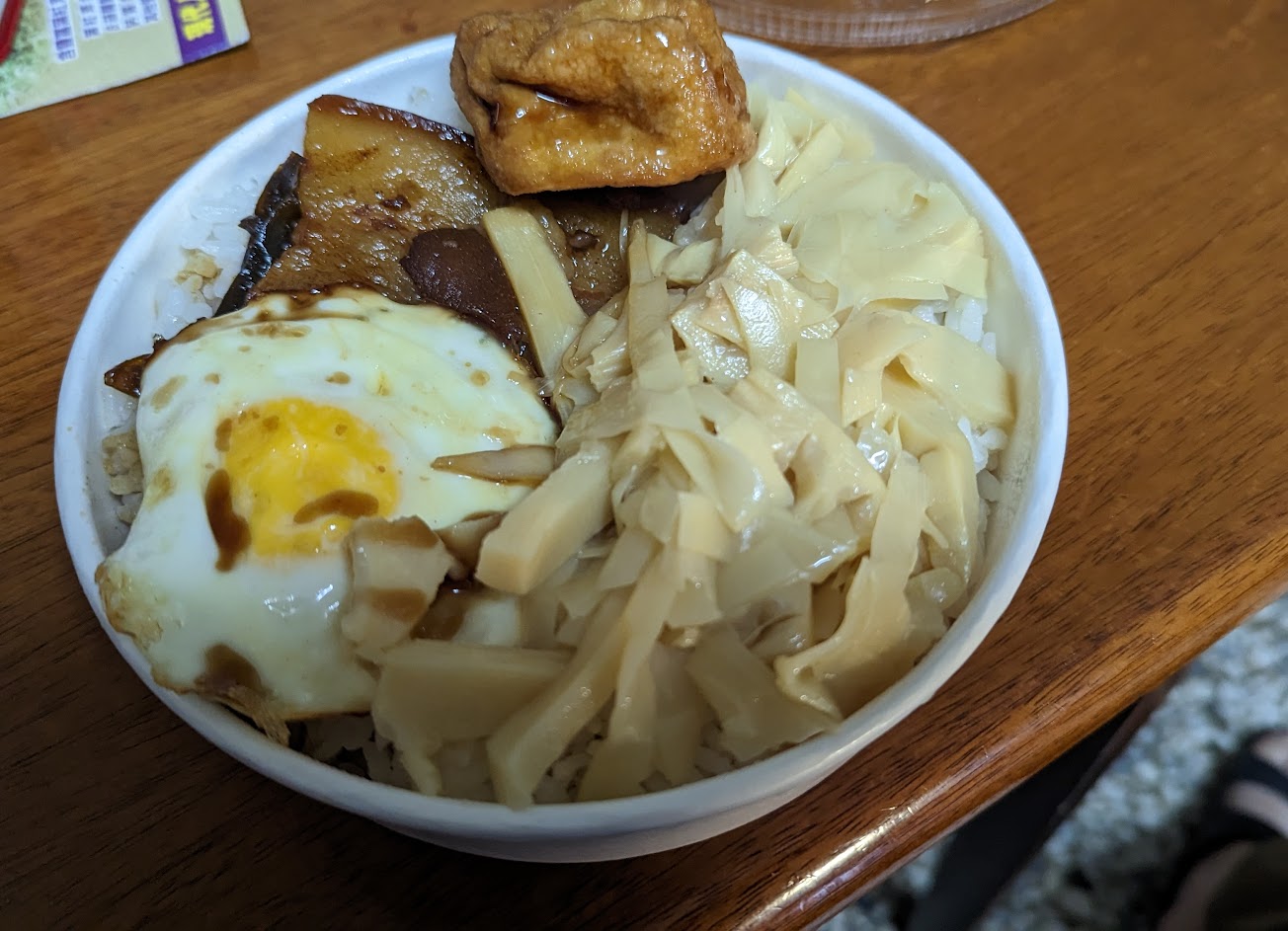 配菜有筍乾、豆腐、一塊爌肉和一顆荷包蛋,完全沒有菜,整體口味很下飯!