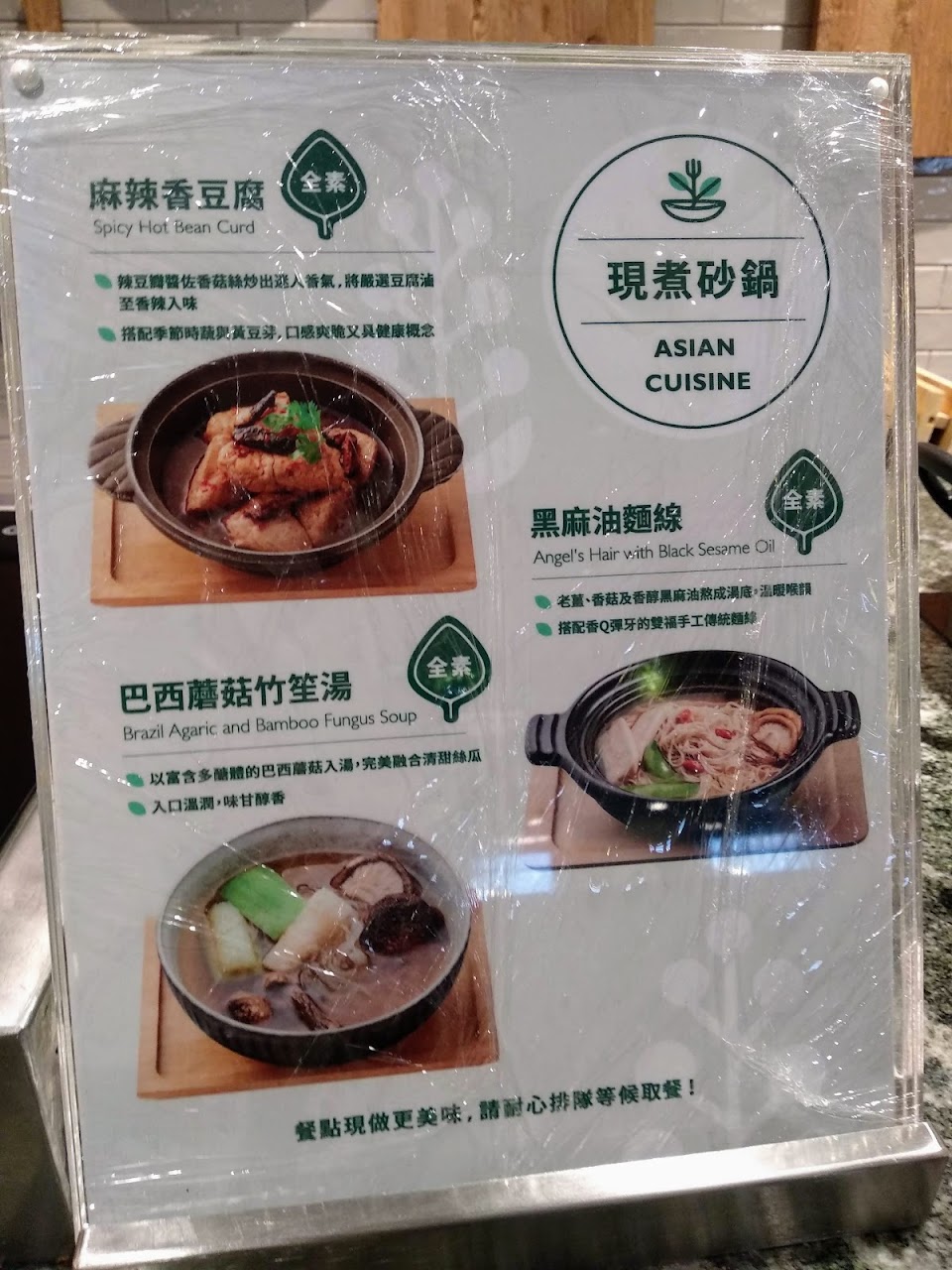 跟自己預期的菜色差了不少,原以為蔬食應有的都找不到,例如天婦羅,杏鮑菇裹粉厚的可怕,樣式也少的可憐。果汁也以為會有奇異果汁之類的,唉,廉價的果汁充數。青菜也沒有幾樣,很想知道大家都來吃什麼?印象中素食自助餐的菜色豐富可口,看來若要吃蔬食,會比較適合我。
