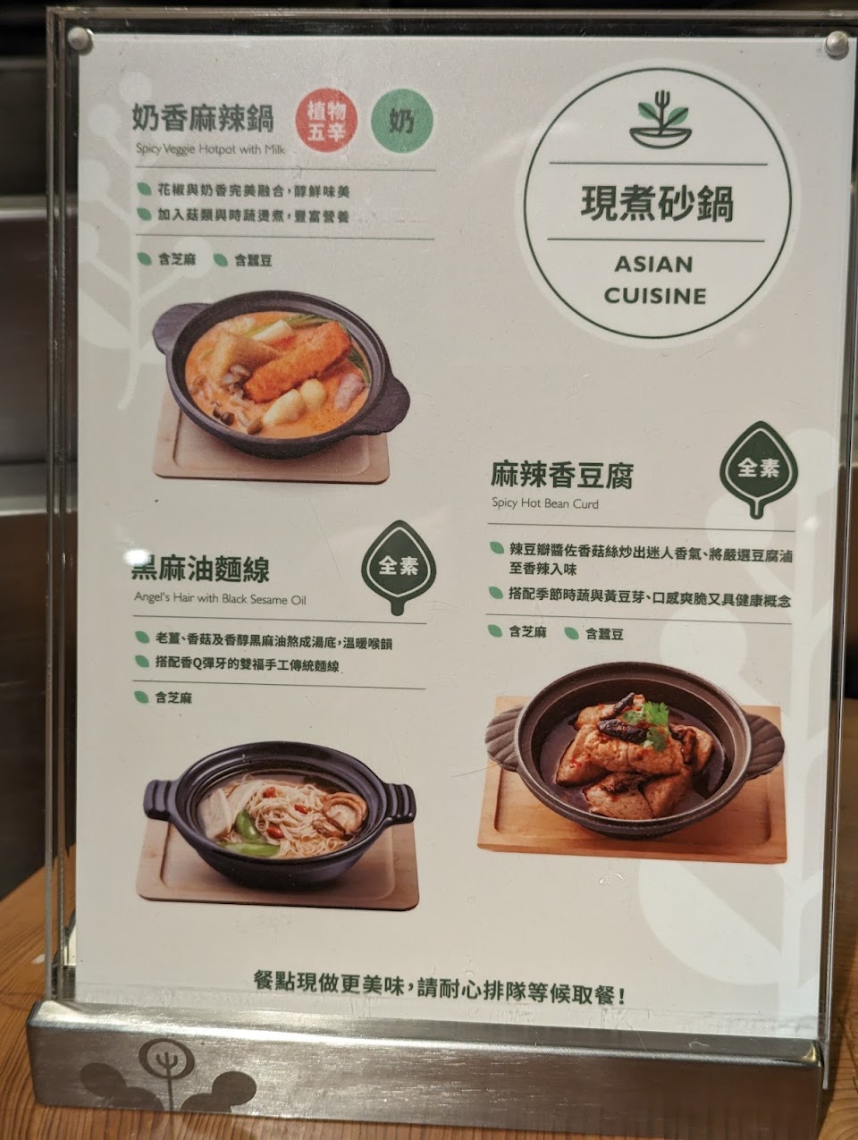 種類多樣,台式、日式、義式、沙拉、炸物、甜品都有,也有清楚標示植物五辛素、蛋奶素,讓蔬食者可以放心享用餐點。