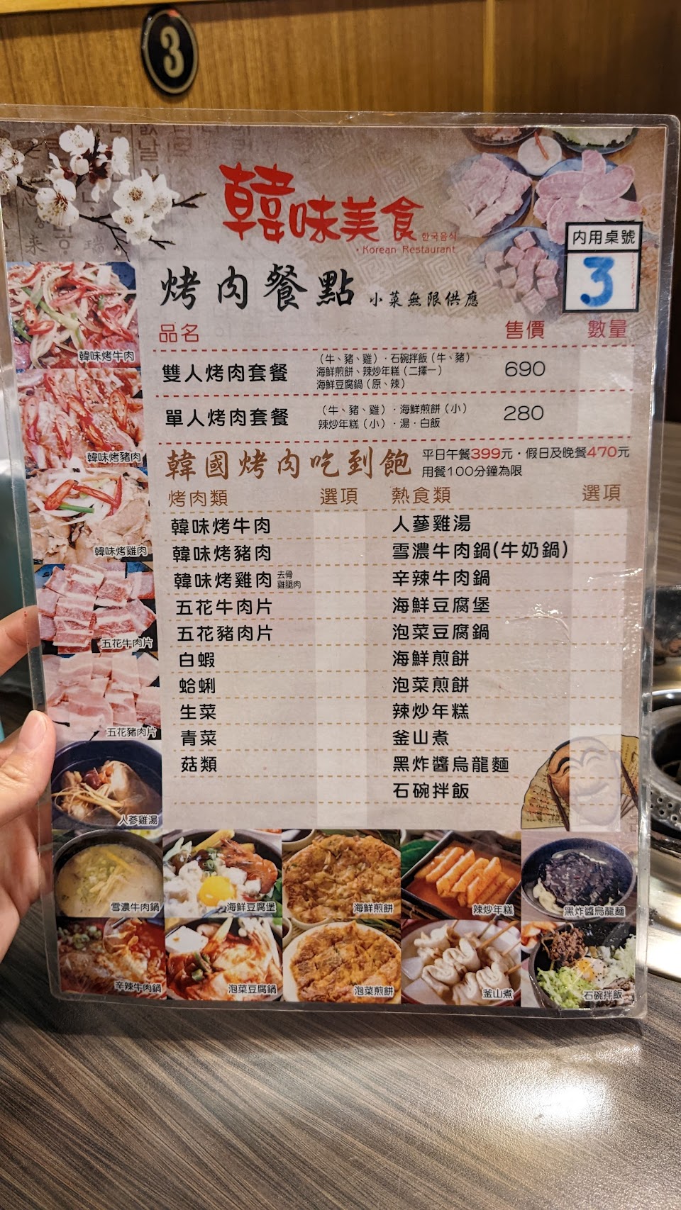 平日中午自己一個人去用餐 ,店家對一個人去消費吃到飽的客人還蠻友善的,老闆娘老板態度都很客氣,有四種小菜可以自己取用 泡菜 海帶 豆芽 冬粉 但飲料的部份只有冰紅茶跟熱紅茶兩種選擇較少,肉類有牛豬雞腿 五到六種,還有可以點的單品 辣炒年糕 牛肉湯 煎餅等等七八種選擇,肉品類 品質算不錯 海鮮部份也有白蝦跟小蛤蜊 食材算新鮮,整體上平日中午380吃到飽又不加服務費的價錢 算CP值很不錯的選擇,適合單身自己一人突然想吃燒肉的不錯選擇 但店家位置不多 可能要先提前打電話訂個位 希望店家能在飲料部份多增加個氣泡類的選擇會更優質 ^^