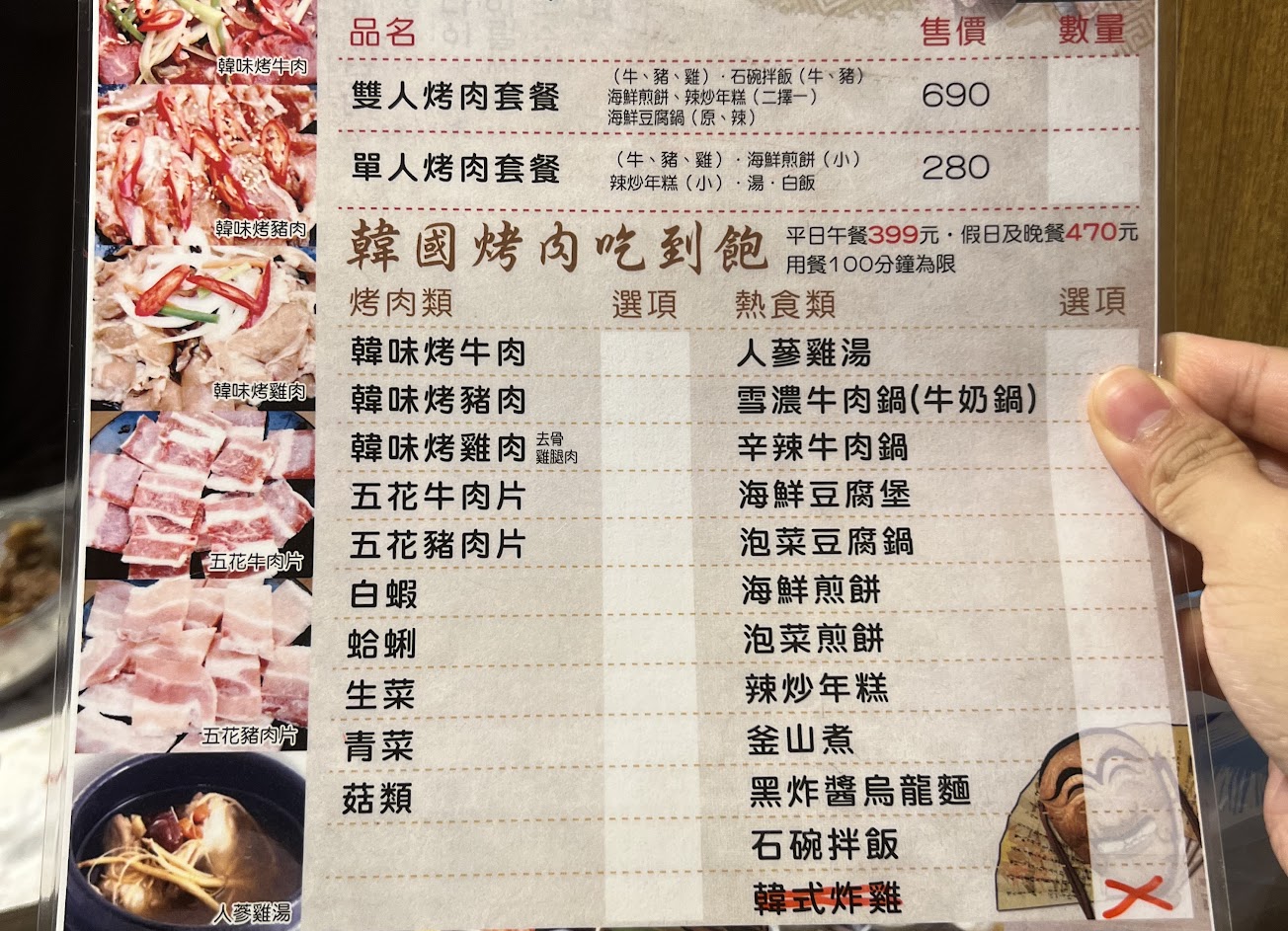 不想跟蟑螂共食的不要來吃 餐點有頭髮就睜一隻眼閉一隻眼 桌上還有蟑螂看我們吃飯是怎麼回事 銅板烤肉吃到飽個人覺得很沒必要 500去吃其他韓式燒烤都比這家好吃 牛肉完全嚼不爛 雞肉有味道 湯死鹹 銅板小不易熱 火鍋部分也很小 不過也有好吃的啦 海鮮煎餅 雪濃牛肉湯(不要吃牛肉 湯加水或是清湯) 光蟑螂部分就覺得老闆很沒心 沒換座位就算了 還現場再食物旁邊幫我打蟑螂 有夠傻眼