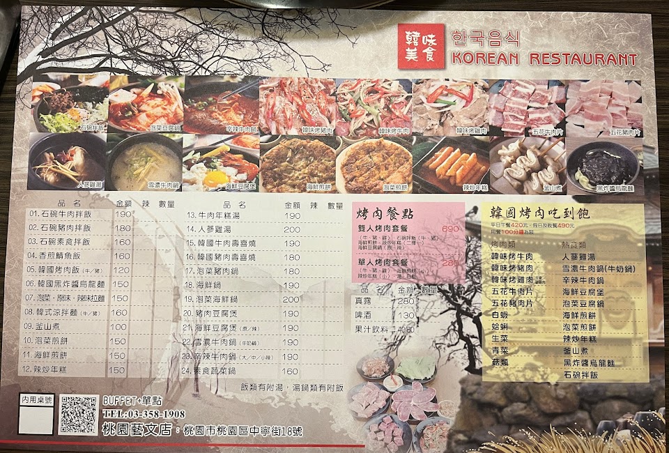突然google查到的店,第一次來到。訂價實在,生意一直都不錯。小菜有四種可以無限供應,飲料有無糖冰綠茶跟有糖紅茶也是免費,氣氛有韓國味。口味也可以,除了各種單點主食外,也有銅盤烤肉吃到飽的選項(好像是一人470元),也有雙人銅盤套餐,個人銅盤可以選擇。應該是在地人氣韓式料理,服務大姐也是很親切各種介紹