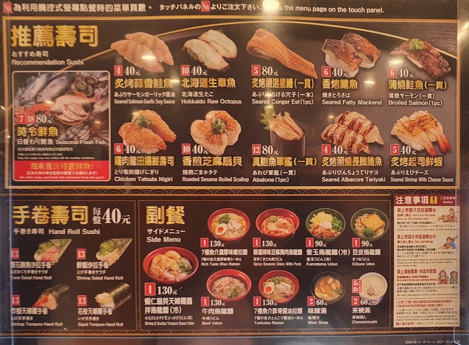 20200622再訪N次,壽司郎進駐台灣推動了各家迴轉壽司的發展,大鮮蝦也出現在一盤四十,高單價的黑鮪魚肚,鮭魚卵,生干貝也加入菜單,麵類還是偏貴,不過菜單的改動會讓我比較想再訪。