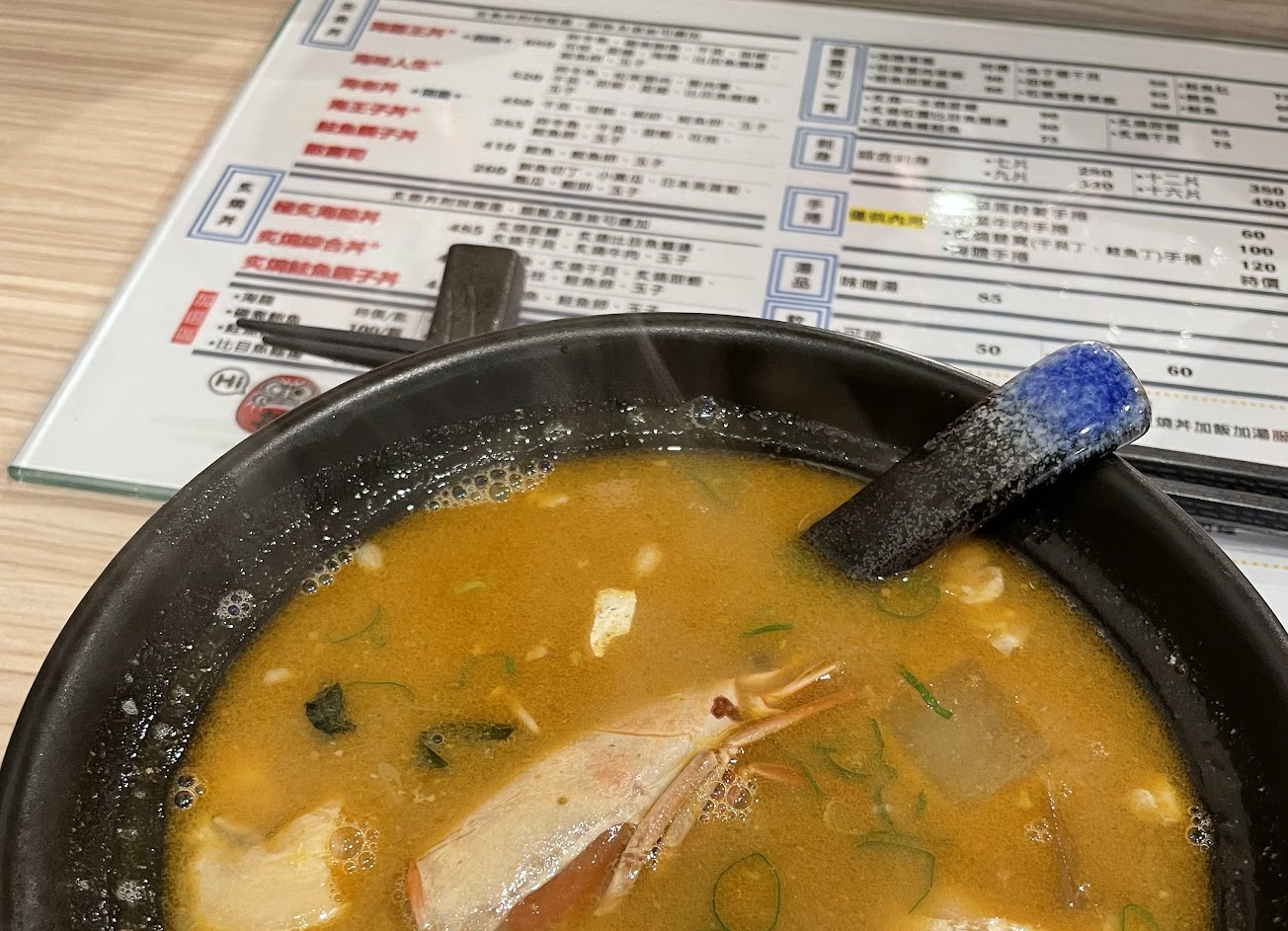 點丼飯有送味噌湯,有蔬菜+蝦頭去熬煮,好喝不會太鹹,超大一碗可以無限續