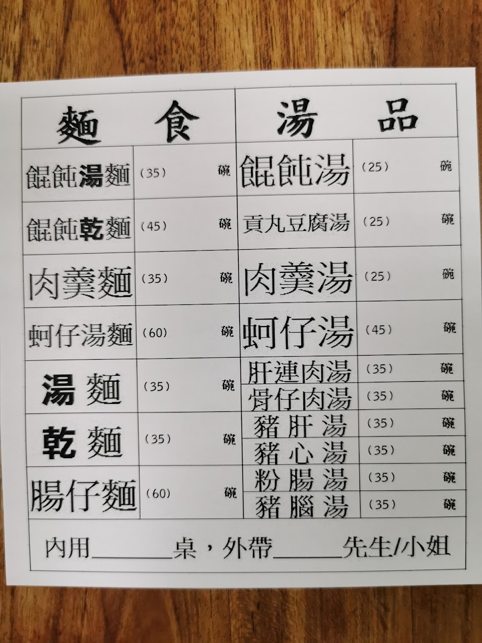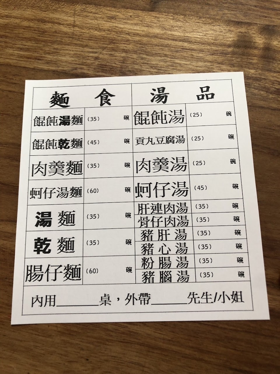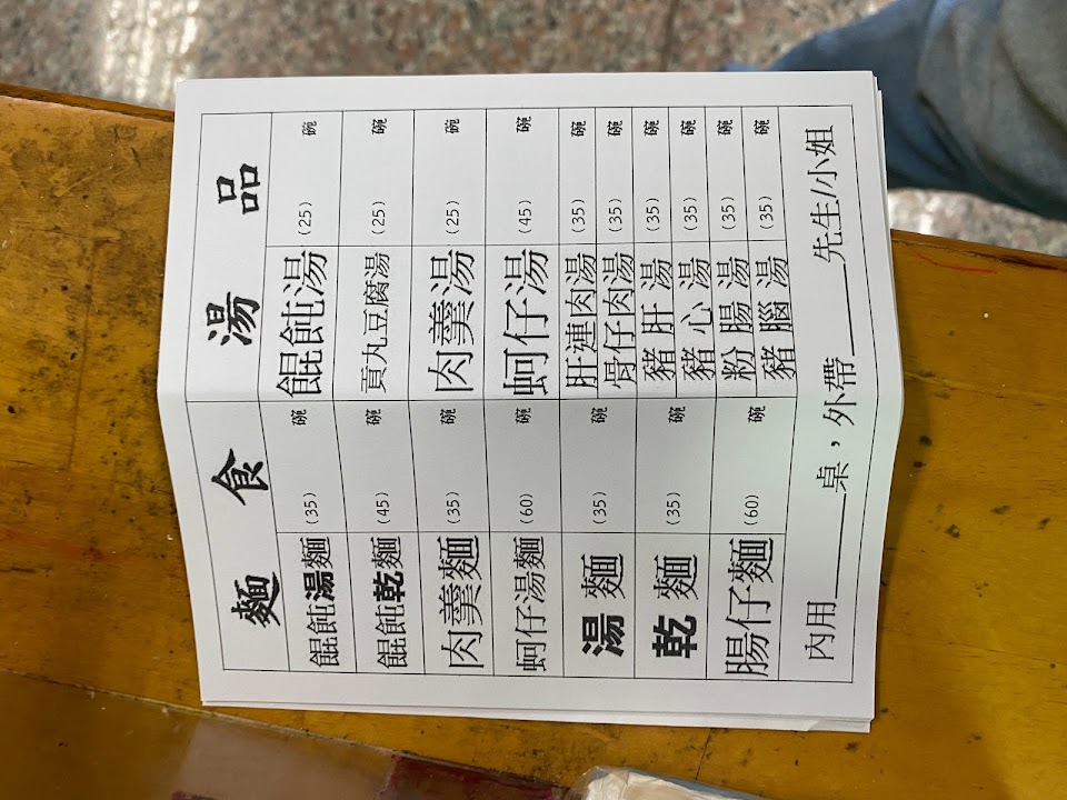 畫好單給老闆,小菜不能畫單要跟老闆用叫的,坐在位置上等了20多分鐘快半小時沒上麵也沒來詢問要不要小菜。比我們晚來的客人都已經上完在吃麵了。去問老闆都只顧著用外帶的,一直有人外帶都先給外帶的,氣到我們連吃都沒吃到乾等三十多分鐘。希望老闆人手不夠可以請個臨時工,動線要加強,還未加工的內臟放地上也蓋塊防水布至少不會招蒼蠅。