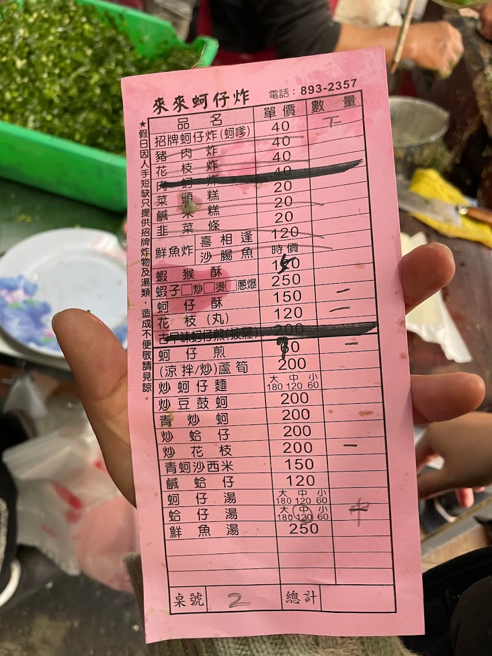 2022年7月1日晚上點了蚵嗲40元 蚵仔煎60元 蚵仔炒麵(中)120元,夏天蚵比較大顆好吃,每個都好吃新鮮,只有炒麵是甜的比較不習慣,但麵炒的好吃 平均每人消費金額 $1-200