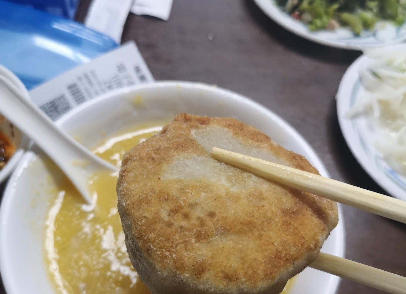 位在中興的學西路,店面算滿大的,附近也還算好停車,假日除非一開業就來,不然通常都是要等候10-20分鐘,路過時常常能看到店門口聚集很多人。味道吃起來就是「粳粽」的味道,糊糊的帶一點顆粒、味道上會比較單調、容易覺得膩,但如果加了一定比例的砂糖就會提味很多,就像我們吃粳粽時要沾砂糖是一樣意思,是非常純粹的眷村味兒~