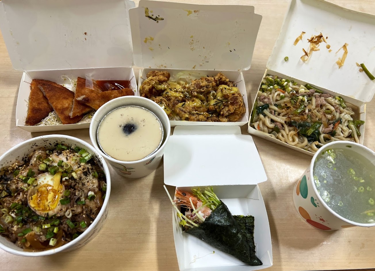 泡菜牛肉蓋飯、月亮蝦餅、唐揚炸雞塊、日式炒烏龍麵、鮮蝦手捲、蛤蠣湯、茶碗蒸