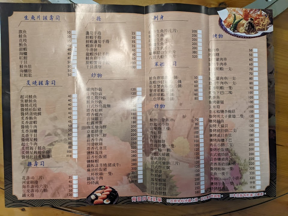 跟朋友一起吃800元套餐2份(3人一起吃)還有單點手卷,生魚片算厚,而且新鮮好吃?,上餐速度快,餐點跟北部比算便宜,口味符合蠻好吃的?,來南投不知道要吃什麼的朋友可以來吃,建議先訂位,因為剛好來的時間有空位,不然會沒有位子吃,內部環境蠻有特色,(洗手間男女分開各一間)