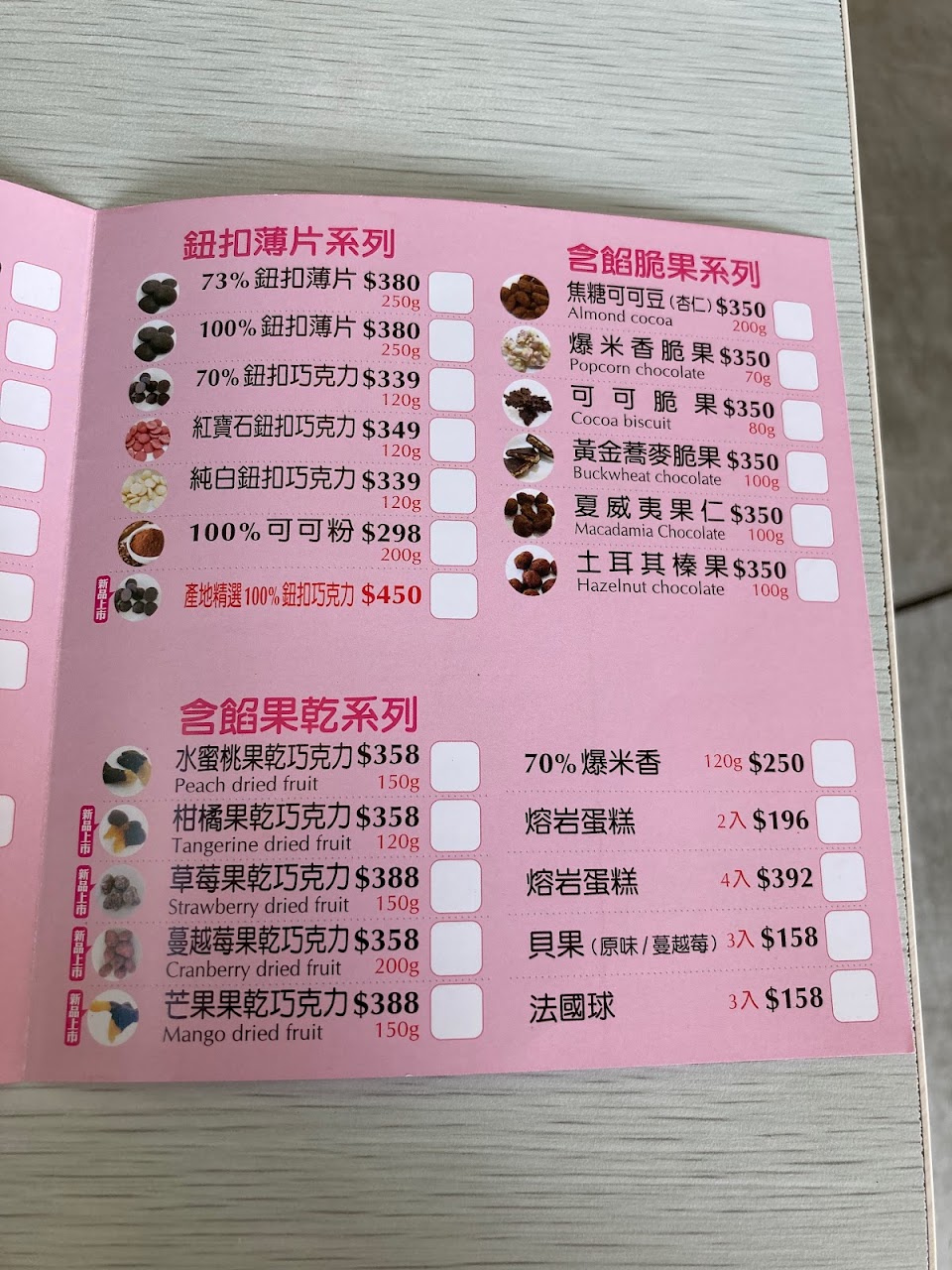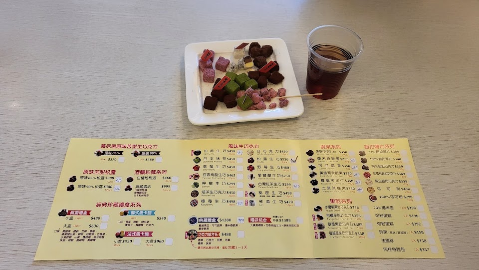 生巧跟黑巧都很好吃,位置也不少,很悠閒;停車方便,店前可停,若沒有位置可停路邊。店家試吃大方。