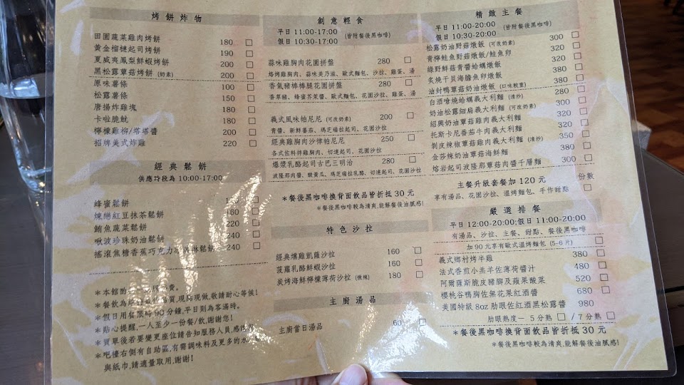 餐廳內提供多種餐點可做選擇,包含單品點心(沙拉、烤餅等)、鹹甜鬆餅、創意輕食(拼盤、三明治等)、精緻主餐(燉飯、義大利麵等)、嚴選主餐(雞腿排、豬腳等)及飲料 …