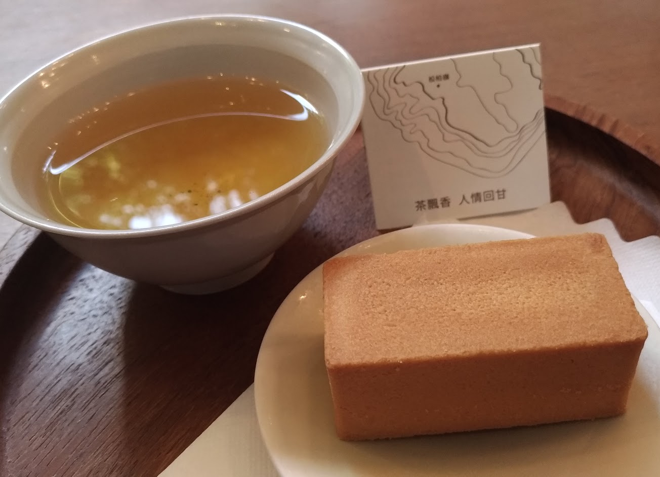 平日前來,入座不用排隊,店員帶位後很快就送上招待的熱茶和一塊鳳梨酥,木製圓盤跟手做的杯盤很有品味,鳳梨酥還稍微烤了一下熱熱的、外皮香酥,純鳳梨的自然酸甜,超好吃!配上熱茶,真的好享受。