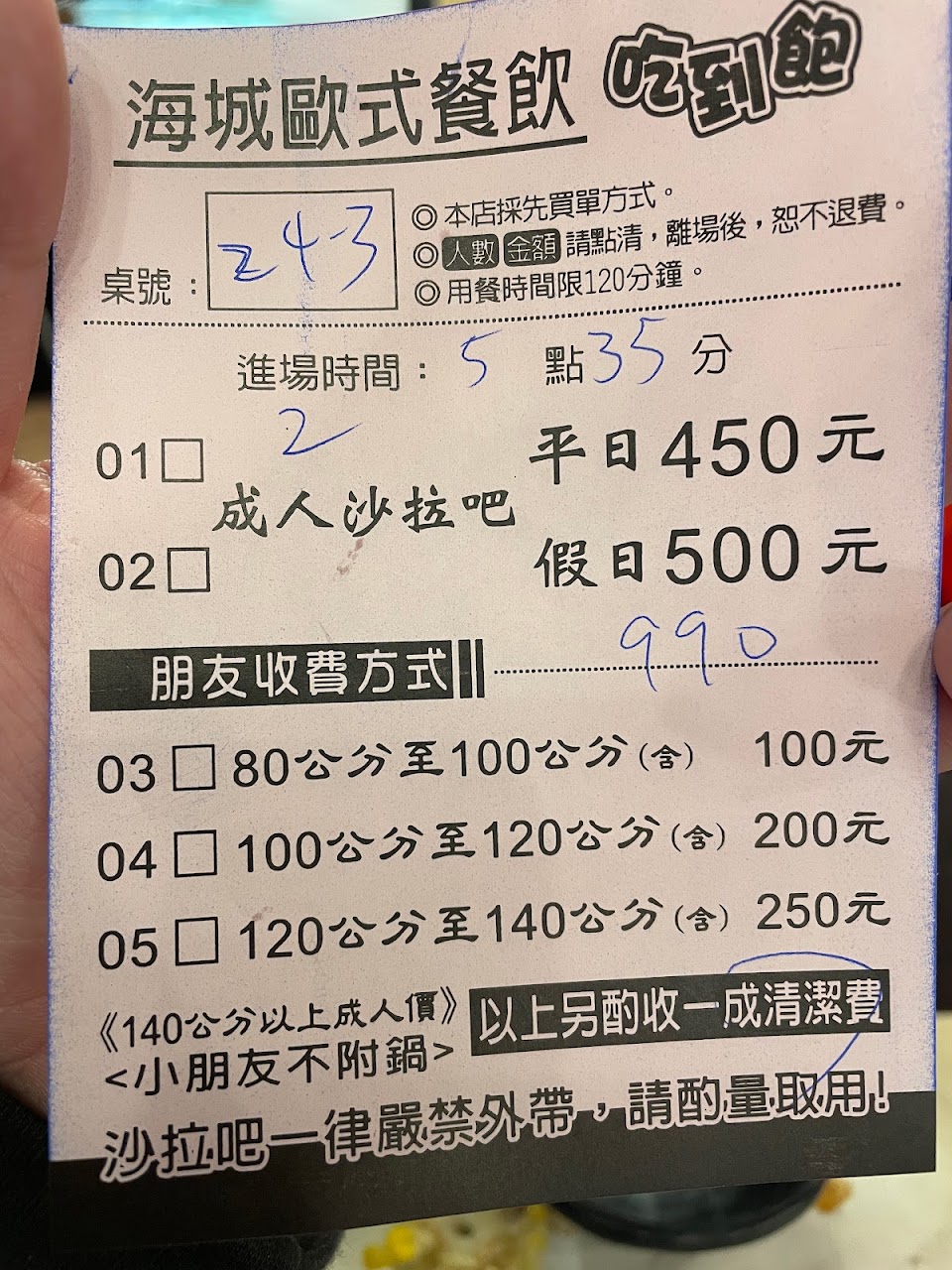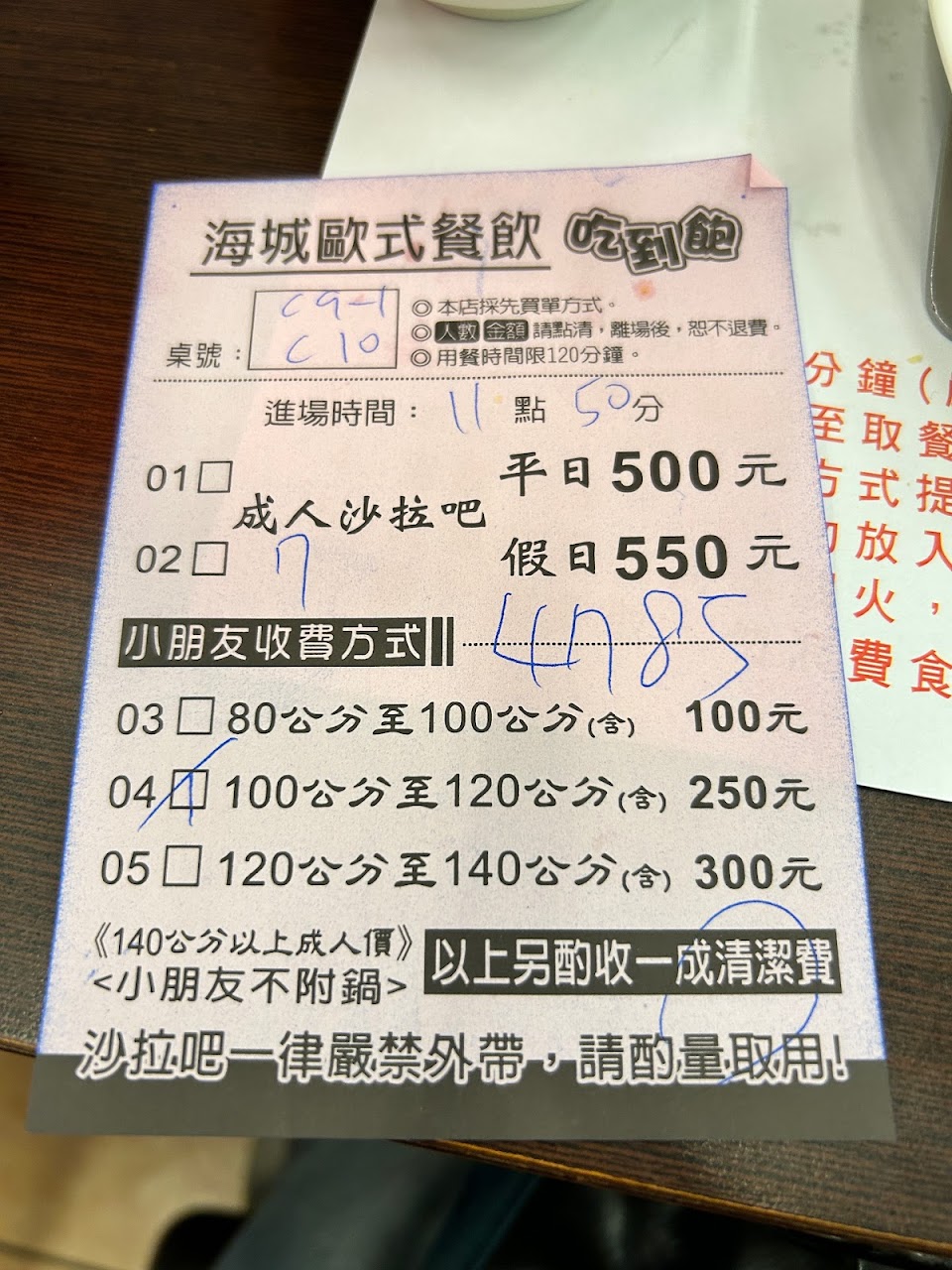 2023/8/5因為父親節又去一次,因為我們那時訂位已經很晚了,只剩下19:10的位置,進去前必須先付款,而且付完款服務人員也沒點人數,直接讓我們進去,進去時人很多,我們的位置是在牛排旁邊的小門裡面,每當要拿東西時必須穿過人龍,很怕排隊的人沒看到後面有人要過撞到,雞豬牛排排隊至少都需要20分鐘左右,食物的吃起來很廉價一般,菜色也沒有很多種,推薦「酥皮濃湯」味道還不錯但可惜裡面沒什麼料,冰淇淋的部分也還行,他們的冰淇淋很像土耳其冰淇淋一樣有黏性。
