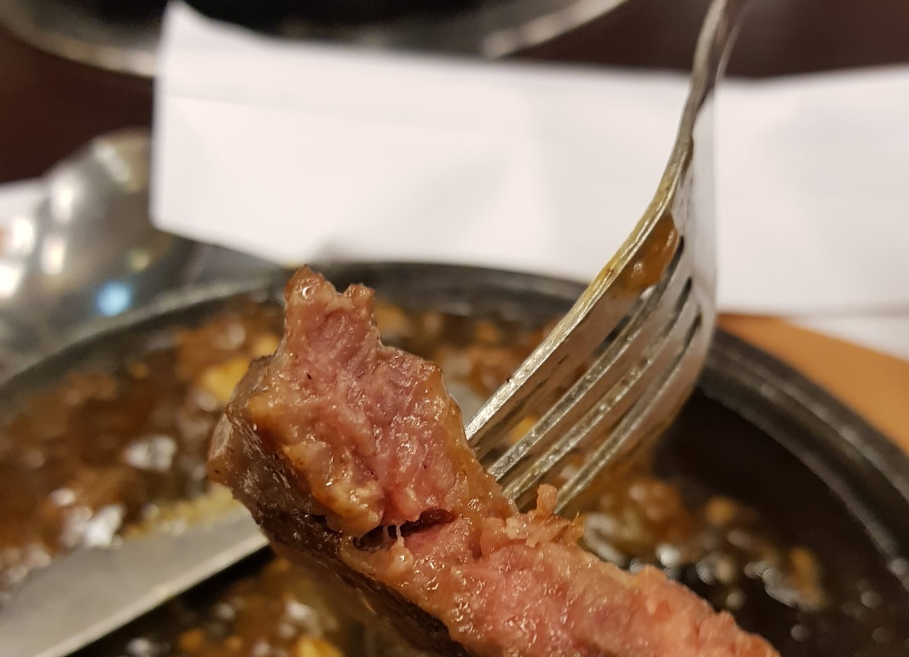 菜色不多,挑來挑去只對鐵盤牛排有興趣。但,牛排的鐵盤沾著不知哪位客人留下的洋蔥,歷經清潔的洗刷後仍頑強地依附,隨著燒熱的鐵盤掛著半空甩,服務員面不改色地,夾上肉片倒下醬汁,新舊洋蔥混在一塊兒,就也看不出來了。