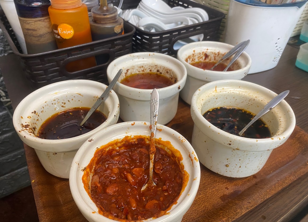 鮮蝦餛飩麵新鮮好吃, 辣椒醬種類眾多, 人潮算多, 但不是很習慣小菜是冷的, 還是比較喜歡加熱滷味